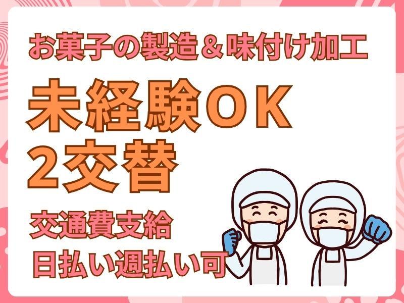 仕事内容 【長期】 老舗メーカーでのお菓子の製造のお仕事です♪ ☆材料投入 ☆味付け ☆焼き、加工 ☆製品ピックアップ 未経験でもすぐに覚えられる内容なので、製造経験のない方でもまずはご応募ください♪