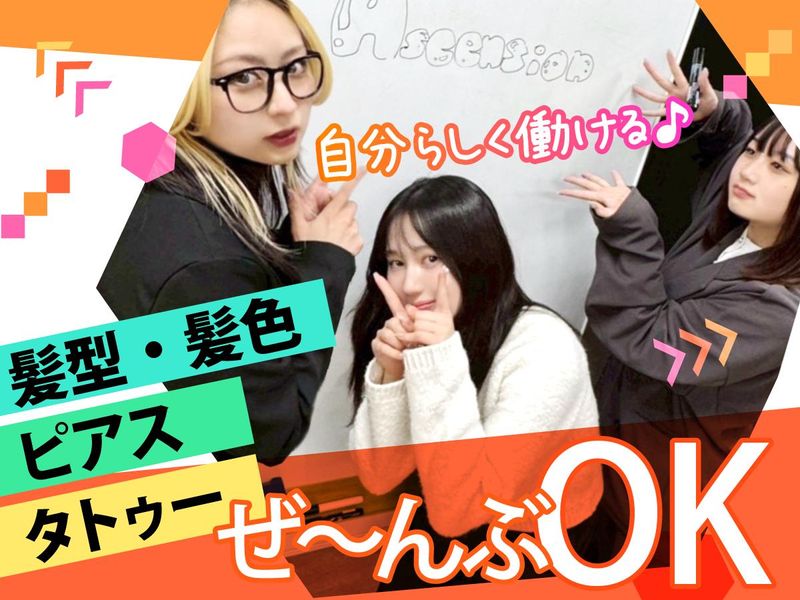 仕事内容 ⭐未経験積極採用中⭐ 会社のストーリーを外に広げる 新しいメッセンジャー募集! 普通やレールに敷かれた人生は面白くない! ただ人生をより良くするのは「仕事」だ! 「仕事」の常識を今ここで変えてやる! 「楽しい」×「個性」の発信が最強だ! もちろん「派手髪」「ピアス」 「タトゥー」「ネイル」「服装」も自由♪ 完全に「個性」と「内面」の ストレートで勝負する会社です! ◎まずは先輩の元でシンプルなお仕事から! 慣れてきたら実力や 希望に沿ってお仕事をお任せ♪ 〈具体的な仕事内容〉 ・公式HPの更新やリニューアルサポート ・求人の作成と掲載 ・オリエンテーション対応 ・SNSでのPR ・社内イベント企画 ・自社ブランドイメージの管理 ・PR企画のアイデア出し ・広報効果の分析 などなど 刺激が足りないチャレンジャーへ! キャリアアップ制度を活用しながら、 幹部も狙えちゃう制度も! 人事・マーケティングや その先の経営までの実力も つけることもできます! \社長からのメッセージ / 皆さんはじめまして! タトゥーと拡張ピアスで個性的な 代表の二岡です(笑) 僕は小さい頃から親から ちゃんとした人生を歩むように 言われて育ちました。 でも、ずっと息苦しく、 どこかで「本当の自分」が 押し込められているような感覚でした。 いつしか自分を持てなくなり、 周りの目を気にするようになりました。 転機になったのは、10代の頃に出会った 誰にも理解されないような重い音楽。 それは世間ウケとは 程遠いジャンルでしたが、 歌詞もサウンドもまっすぐに 感情をぶつけてくるその音楽に 僕は雷に打たれたような衝撃を受けました。 誰かの「正解」に合わせなくていいんだ。 もっと自分を持とうと思いました。 そこからは、とにかく自分らしく 生きようと思いました。 タトゥーを入れ、耳には拡張ピアス。 見た目も価値観も、世間からすれば 「はみ出し者」だったかもしれません。 当然、就職活動では話も聞かれず、 「その見た目じゃ無理だよ」 と言われる日々。 家族からも、親からは出世している 従兄弟と比べられる毎日。 悔しくて、悔しくてたまりませんでした。 「見てろよ、絶対に正解へ変えてやる!」 その一心で、上京を決意しました。 その後、未経験から営業、人材育成、 マーケティングを学び、 その後この会社を立ち上げました。 僕と同じような経験をしている人を 少しでも減らしたい。 そう思い発信しています。 過去は変えることができる! 学歴も、見た目も、過去も関係ない。 型にハマらず「自分らしさ」と「個性」を 大切に前向きな気持ちで勝負してほしい! そんな皆さんのための会社で あり続けたいと思ってます! 株式会社Ascension公式HP: https://ascension.tokyo