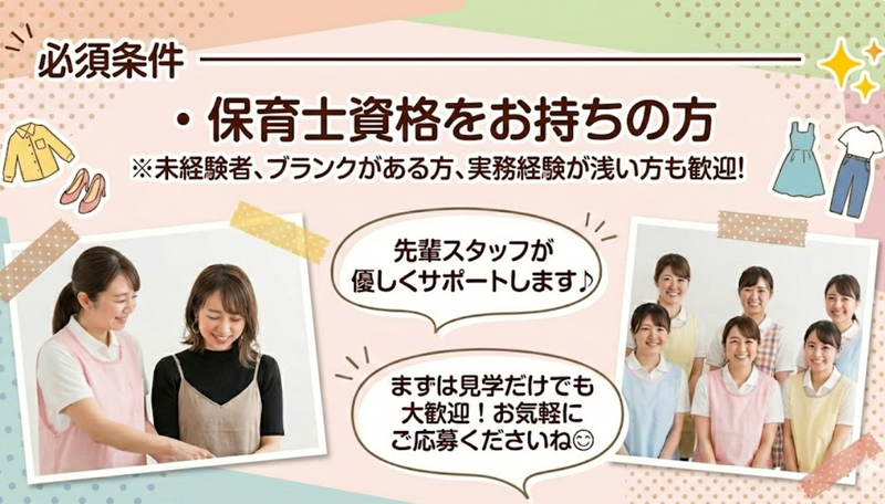 求めている人材 ✨必須条件 ───────────── • 保育士資格をお持ちの方 ※未経験者、ブランクがある方、実務経験が浅い方も歓迎! ✨ 歓迎条件 ───────────── • 子育て経験がある方(主婦・主夫歓迎) • ピアノが苦手な方、書類作成が苦手な方も歓迎 • ハローワークでお仕事探し中の方も歓迎 ✨ 求める人物像 ────────────── • 子ども一人ひとりとじっくり向き合いたい方 • チームワークを大切にし、明るくコミュニケーションが取れる方 • プライベートと仕事をきっちり分けたい方
