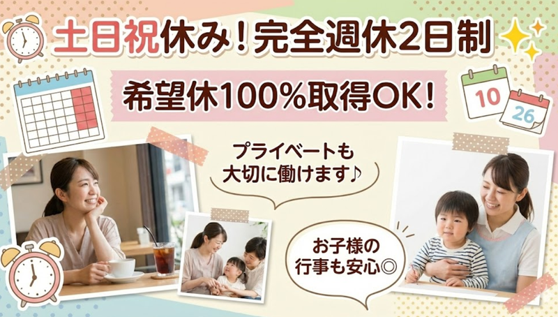 休日休暇 ◆休日休暇 休日・休暇 ━━━━━━━━━━━━━━━━━━━━ • 完全週休 2 日制(土日祝休み) • GW 休暇 • 夏季休暇 • 年末年始休暇 • 有給休暇(法定通り付与/消化率高めです!) • 産前産後・育児休暇(取得実績あり) ★お休み希望は 100%取得可能! お子様の急な発熱や行事にも柔軟に対応します。 • 推し休暇(リフレッシュ休暇)