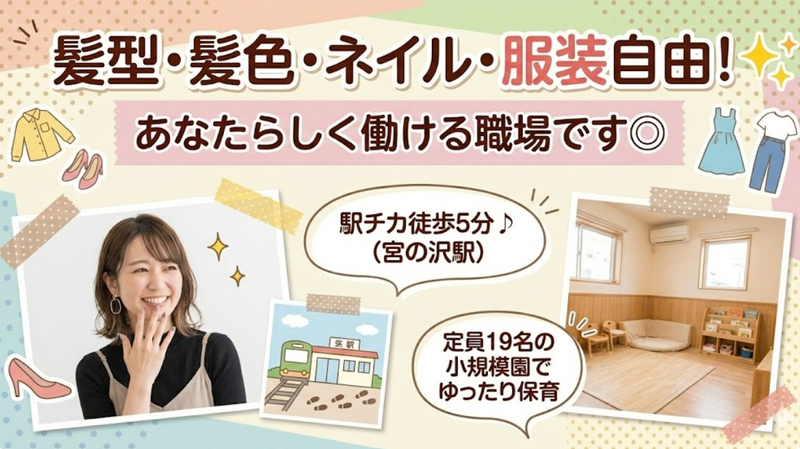 職場環境 【心にゆとりを持てる環境】年間休日120日&完全週休2日制で、残業は月平均5h程度。 持ち帰り仕事もありません。賞与や手当も充実しており、長く安心して働ける待遇が魅力。 子ども一人ひとりの個性を大切にする温かい雰囲気の中で、丁寧な保育が実践できます。