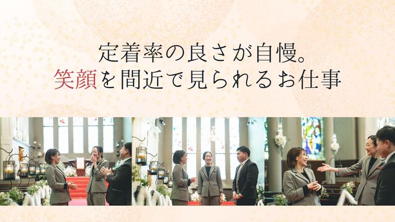 仕事内容 結婚式場でのお客様のおもてなし業務全般をお任せします。 <具体的には> ■お客様のお出迎え・ご案内 ■お荷物のお預かり ■挙式進行のサポート ■パーティ会場のセッティング ■パーティでの料理・お飲み物の配膳 などなど…周りの先輩スタッフがしっかりフォローするので、未経験スタートも安心です!