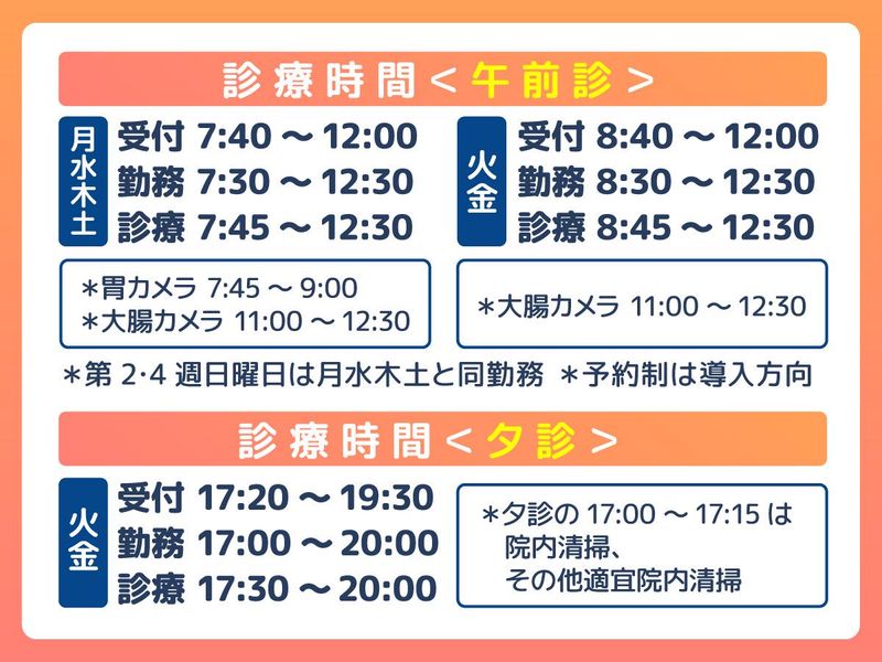 勤務時間詳細 週3日~勤務OK <午前診> ◆月水木土 受付 7:40~12:00 勤務 7:30~12:30 診療 7:45~12:30 (胃カメラ 7:45~9:00、大腸カメラ 11:00~12:30) ◆火金 受付 8:40~12:00 勤務 8:30~12:30 診療 8:45~12:30 (大腸カメラ 11:00~12:30) *第2、4週日曜日は月水木土と同勤務 *予約制は導入方向 <夕診> ◆火金 受付 17:20~19:30 勤務 17:00~20:00 診療 17:30~20:00 *夕診の17:00~17:15は 院内清掃、その他適宜院内清掃