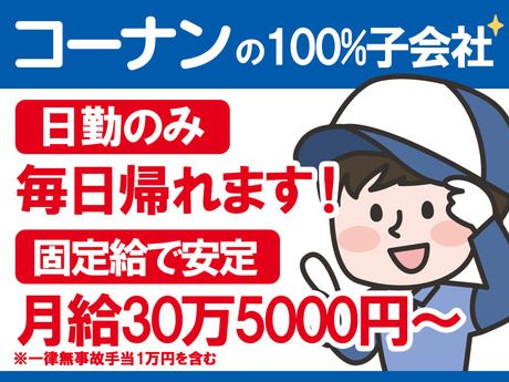 仕事内容 ■ホームセンターコーナンの店舗へ配送のお仕事 「ドライバーは体が資本」なんて言いますが、 私たちは”仕組み”が大切だと考えています。 積み降ろしはパワーゲートを使用。 荷物は全てカゴ車やコロ車などに 積載されており、”押して”運びます。 基本的に、手積み・手降ろし作業はナシ。 身体への負担が少ないので、 年齢・性別関係なく長く続けやすい 配送スタイルです。 ────── 仕事内容 ────── *4tウイング車(パワーゲート付き)を使用した輸送 *空のカゴ車などの備品(マテハン)回収や、返品・修理品、店舗間で移動する商品などをセンターに戻す作業 *社内メール便の配送など 店舗内への立ち入りや商品の陳列作業は一切なし! 荷受け場まで運び入れて作業完了です。 ▼配送エリア: →大阪南港~大阪市近郊 ▼配送件数: →1日平均6~7店舗(焦らず落ち着いて配送できます) ■ココがPOINT! ◎「安定給与」を保証!  ̄ ̄V ̄ ̄ ̄ ̄ ̄ ̄ ̄ ̄ ̄ ̄ ̄ ̄ 月給30万5000円~を固定で保証! 頑張り次第で稼げる歩合制ではなく、 安定した固定給で収入が保証されます◎ ※現在、効率化を進めている過程で、残業が発生する場合もありますが給与は固定です。 将来的に残業が減っても給与は変わりません◎ ◎ブランクOK  ̄ ̄V ̄ ̄ ̄ ̄ ̄ ̄ ̄ ̄ ̄ ̄ ̄ ̄ 「久しぶりの仕事復帰」という方も スタートしやすい環境が整っています! トラックは基本的に個人専用にて管理◎ *カーナビ・ドラレコ・バックモニター完備で安心! *従業員専用駐車場あり! *ロッカー完備! ※新車のトラックがお待ちしております♪ ■配送スケジュール(例) 1日を3便に分けて効率良く配送します! ▼1便目/7:00頃開始 →検品・1~2店舗分の積込後、出発。 ▼2便目/10:00頃開始 →マテハン回収後、検品・2~3店舗分の積込後、出発。 ▼3便目/14:00頃開始 →検品・1~3店舗分の積込後、出発。 ※休憩は2便目終了後、まとめて1時間(13:00~14:00頃)の取得を基本とします。 業務状況により分割して休憩してもOKです◎ ■あの”コーナン”の100%子会社! 当社は、東証プライム上場「コーナン商事」の 100%子会社として、運送事業を新規開業しました! 安心のブランド力と、 盤石な経営基盤を持つ当社で、 事業の立ち上げメンバーとして、 安定して長く働いてみませんか? 「働いた時間だけ稼げる」環境から、 「メリハリのある家族も安心できる働き方」へシフトしたい方に最適な環境です! ■スタッフインタビュー 前職は「働いた分だけ稼げる」環境で、 やる気次第で収入は増えました。 ですが、毎日重い荷物の手積みもあり、 帰宅時間もバラバラ…。 体力的にかなり厳しい状態でした。 結婚してからは、妻や両親から 「この先も続けられるのか」 と、心配されることが増えまして…。 そこで、収入よりも体への負担が少ない 会社へ転職しようと思い、当社に出会いました! コーナンの100%子会社で安定性は抜群。 固定給なので安定して収入も得られます。 運行スケジュールが決まっているので、 毎日ほぼ決まった時間に帰宅できるのも嬉しいです! 家族との時間はもちろん、 自分の体調管理にも意識を向けられるようになりました!