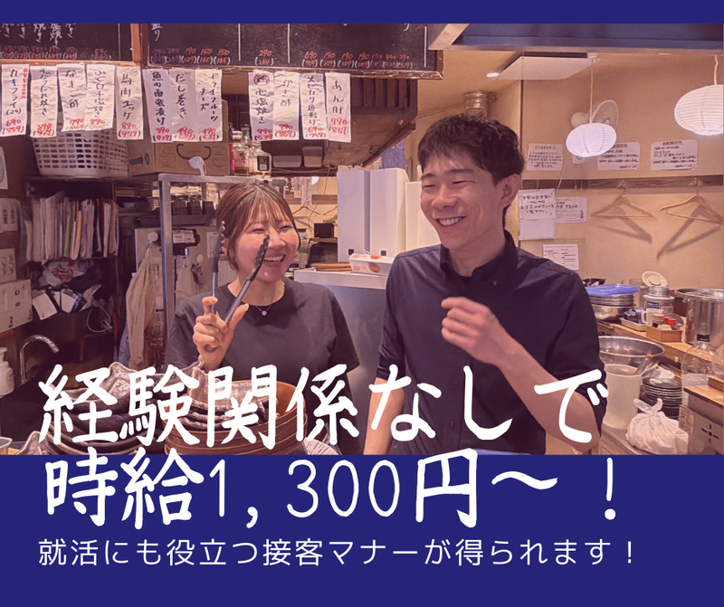 仕事内容 【各線「なんば」駅スグの好立地!】 【人気の居酒屋で一緒に楽しもう!】 【経験関係なしで時給1300円~!】 【アルバイトから正社員へ登用有!】 【就活にも役立つ接客マナーが得られます!】 【お仕事内容】 大人気のお店でカウンター越しのホールのお仕事をお任せします! スマホオーダーシステムなので、作業も想像以上にスムーズです! 1)朝からは、オープンに向けての開店準備を行って頂きます。 ・簡単な仕込みの準備やカウンターを拭いたり、掃き掃除をお願いします。 2)ご来店頂いたお客さまの人数を確認し、カウンターのお席へご案内して行きます。 3)お飲み物やお料理のオーダーをお聞きしていきます。 ・スマホに入力すれば、それだけでOK! 4)お料理やお飲み物をご提供していきます。 ・慣れてくれば、少なくなったお飲み物を見つけたら、おススメのハイボールなどをご案内して行きます。 5)お帰りになるお客さまのお会計やお席の後片付けをお願いします。 ・食器の洗浄は、自動食洗機へ投入すればOKなので、ご安心下さい! ・ポイントは、元気に明るく「いらっしゃいませ!」「有難うございました!」が言えればOK! ・それとお待ちいただいているお客様も多くいらっることが有りますので、スピーディーにお願いします! (実は、スタッフのほとんどは1日が、あっと言う間に終わるので、すごく充実感が有って楽しいとのことです!)