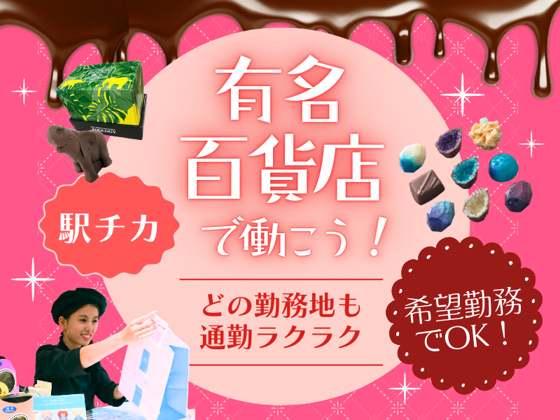 仕事内容 2026年1月21日~2月14日の期間限定! 【岡山高島屋本館】にて、 バレンタインチョコの短期バイト募集♪ 9時~20時で、1日5h~シフト相談OK! 週1日~勤務日数・曜日も相談OK! 他にも勤務地多数!好きなお店で働けます。 給与振込が早いのも嬉しいポイント! (1/16~2/15勤務分の給与は2/27振込) まずはお気軽にご応募お待ちしています! - 【具体的な業務内容】 ・チョコレート販売 ・レジ対応 ・商品をオススメする あなたに取り扱っていただくのは、 バレンタインの可愛いチョコレート♪ おしゃれな惑星型や動物型、 あの有名なキャラクターとのコラボなど いろいろなチョコを取り扱うので、 見ているだけで楽しくなります! 人気のチョコを30%OFFで買える お得な社割もあります♪ 【入社後の流れ】 まずは、上司と一緒に研修からスタート。 勤務中は近くに先輩や上司がいるので 気軽に助けてもらえる職場です! 【お仕事に慣れてきたら…】 チョコ販売やレジ対応に慣れてきたら、 お客様のチョコ選びの相談にも のってあげてください♪ 好きな人だけでなく、家族や友達、 いつもお世話になっているあの人へ… など、お客様のチョコ選びの内容は様々! ちょっと責任重大!…なんて身構えずに、 まずはお客様のお話を聞くところから はじめていただければOKです♪ - 【シフトについて】 9時~20時の間で1日5時間~相談OK♪ 週1日~勤務日数も相談OK♪ 好きな勤務地で働けます♪ 勤務地に関しては面接にてお話します! - 【志望動機は自由♪】 「短期で働きたい!」 「ガッツリ稼ぎたい!」 「接客が好き!」 など、志望動機は自由♪ 接客未経験歓迎♪ まずはお気軽にご応募お待ちしています! 【30代主婦スタッフインタビュー】 子どもの冬休みが終わり、ヒマになる時期に タイミングよく短期で働けるのが魅力です! 販売未経験でしたが、百貨店なので マニュアルや研修もちゃんとしているので 全く不安なく働けます。 お客様ニーズも様々なので、 チョコ選びのご相談をいただくと やりがいを感じます! また、人気のチョコを社割で安く買えるのも このお仕事の魅力の一つです! 去年も、家族用から自分のご褒美チョコまで たくさん買っちゃいました(笑) 毎年この時期が来るとワクワクします♪ - 【応募について】 年齢・経験一切不問! 応募から採用まで最短1週間程度 まずはお気軽にご応募お待ちしています♪