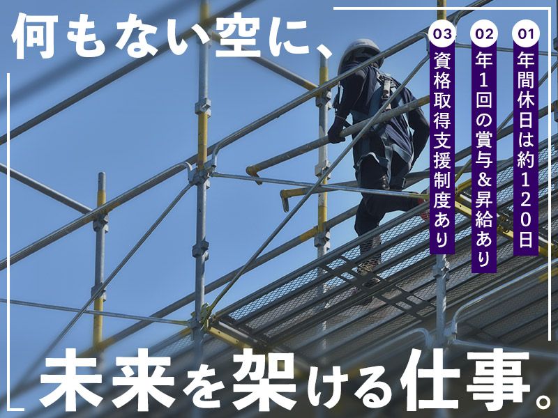 アピールポイント 1. 未経験からプロを目指せる育成環境 入社後のOJT研修で足場組立の 技術を基礎から丁寧に指導します。 業務に必要な費用は会社が全額負担するため、 着実にスキルアップしながら、 鳶工のプロフェッショナルを目指せます。 2. 安心して働ける充実した待遇 賞与に加え社会保険や各種手当も 充実しており、安心して長く働ける環境です。 あなたの頑張りをしっかり還元します! 3. プライベートも大切にできる休日制度 GWや夏季、年末年始に加えて、 完全週休2日制(年間休日約120日)を導入。 仕事とプライベートのメリハリをつけ、 心身ともに充実した働き方が可能です。