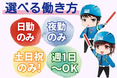 資格・経験 年齢18歳以上(警備業法による)、 交通誘導警備業務1級、2級所持者優遇、 未経験可