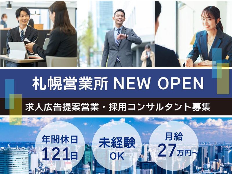 仕事内容 2025年10月に 開設したばかりの 札幌営業所を 一緒に盛り上げてくれる メンバー大募集! ✅未経験者歓迎 ∟研修制度充実&先輩が丁寧にフォロー ✅年間休日123日/完全週休2日制 ∟土日祝休みでオフも充実◎ ✅大通り駅スグ★時計台ビル内のオフィス ∟JRからも地下鉄からもアクセス抜群 ✅中途社員多数活躍中 ∟札幌営業所平均年齢29歳(他事業部含む) ✅月平均残業20時間以下/ノー残dayあり ∟プライベートとの両立もバッチリ ・・・・・・・・・・・・・・・・・・・・・・・・・・・・・・・・・・・・・・・・ \ この仕事、こんなにも面白い / 「求人広告業界×営業職」の特徴 ●経営者の方との接点多数! ●幅広い業界に詳しくなれる ●人事や労務の知識も身につく ●採用難だからこそニーズが尽きない 「営業って難しそう…」 「チャレンジしてもいいのかな…?」 そんなあなたのご応募もお待ちしています! 扱うのは、誰もが知ってる 求人メディア(Indeedなど)だから、 提案しやすくて安心! 未経験から始めた20代社員も多数活躍中✨ ・・・・・・・・・・・・・・・・・・・・・・・・・・・・・・・・・・・・・・・・ \ 安定の経営基盤×多事業展開 / (株)ヒューマンワークとは…  ̄ ̄V ̄ ̄ ̄ ̄ ̄ ̄ ̄ ̄ ̄ ̄ ̄ ̄ ̄ ̄ ̄ 株式会社メガのグループ企業である弊社は 「採用コンサルティング事業」を主軸に、 求人媒体営業や人材紹介業を展開しています 全国に拠点を置き、これまでの取引社数は 約8万社!採用決定人数は、のべ32万人以上 に上ります。 <メガグループとは…> グループ従業員数579名、 海外にも事業を展開! ビジネスサポート領域で様々な事業を 展開しており、働く環境(空間)、 システム、人材までトータルサポート できることが強みです。 ・・・・・・・・・・・・・・・・・・・・・・・・・・・・・・・・・・・・・・・・ 【 お仕事内容 】 求人広告の提案営業& 採用コンサルティング ▶ヒアリング 企業に「どんな人材」が「いつまでに」 「何人必要か」等お話を伺う ▶提案 最適な求人メディアを提案 ▶原稿作成 ヒアリングを元に原稿制作チームに発注 ▶ご掲載 申込書の回収・請求書の送付・原稿OKの 了承を得て、求人原稿の掲載スタート! ▶掲載中 効果分析・改善提案 など 附随する業務として、 ・進捗管理(売上、原稿の管理) ・事務作業(数字入力等) ・内勤への業務依頼(メールでの送信) ※テレアポ・訪問・WEB商談など、 先輩がしっかりサポートします! ―――入社後は 新卒入社の30歳男性営業(所長)が マンツーマンで研修・指導します! 指導担当が明確なため、分からないことも スグに確認できる環境です! 【 理想のキャリア形成を実現可能 】 年2回の人事考課により、 個人の成果や会社への貢献度を 正当に評価する体制を整備。 ―――こんな方にオススメ! 社会人経験のある方歓迎! 社員デビューも応援します! ルート営業や法人営業 接客、販売などの 実務経験がある方は活かせます! (アルバイトなど雇用形態不問) ・・・・・・・・・・・・・・・・・・・・・・・・・・・・・・・・・・・・・・・・ 気になるところまるわかりQ&A  ̄ ̄V ̄ ̄ ̄ ̄ ̄ ̄ ̄ ̄ ̄ ̄ ̄ ̄ ̄ ̄ ̄ Q.札幌営業所のメンバーは何名ですか? A.現在、営業が2名(男性)と内勤(女性) 1名の計3人体制です 今後、営業スタッフを3~5名ほど増員 予定!中途採用でも同期ができます♪ Q.長く働ける環境ですか? A.産休・育休の取得実績も多数! 状況に応じて時短勤務なども 相談できます。 Q.ノルマはありますか? A.目標数字はあります。 考査も数字をベースに行います! ※未達成のペナルティはありません
