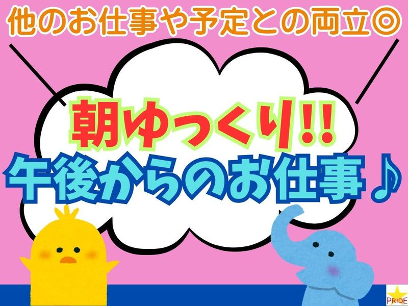 求めている人材 ★経験・資格は一切不要! ★未経験スタート大歓迎♪ <こんな方にオススメ!> ・まずは短い期間からお仕事を始めたい方 ・朝早いのが苦手、午後スタート希望の方 ・残業なしで働きたい方 ・初バイトの方、フリーター歓迎 ・ミドル層も活躍中 →20代~40代の男性スタッフ活躍中! <下記のご経験がある方にオススメ!> 倉庫内作業の実務経験がある方 軽作業の実務経験がある方 仕分け作業の実務経験がある方 ※ハローワークでお仕事をお探し中の方も必見!