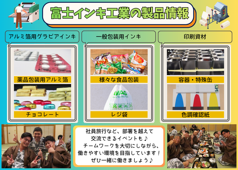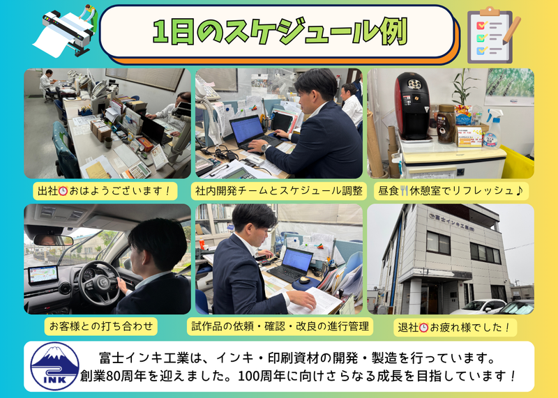 仕事内容 ✨【プロジェクトマネージャー募集】✨ チームの中心となって、ものづくりの開発を動かす面白さを感じませんか?✨ ✅未経験歓迎!充実の研修&OJTで安心スタート♪ ✅少人数部署で風通しが良く、困った時はすぐに助け合える職場◎ ✅基本土日祝休&残業ほぼなし!プライベート時間も大切に♪ ✅体験入社可能!希望があれば、面接後の入社前に業務体験可能◎ ✅賞与年2回&昇給あり!頑張りをしっかり評価します! ✅ネットフリックス手当など手当&福利厚生も充実! ✅宅配弁当や食事補助(半額相当額)など、食事サポートあり! ⏰どんな会社?  ̄ ̄ ̄ ̄ ̄ ̄ ̄ ̄ 富士インキ工業株式会社は、インキ製品・印刷資材を中心に開発・製造を行っています! 品質や環境にこだわり続け、おかげさまで創業80周年を迎えました。 100周年に向け、さらなる成長を目指しています! ⏰仕事内容  ̄ ̄ ̄ ̄ ̄ ̄ インキ・コーティング剤など、自社製品の開発プロジェクトにおける社内外の調整役をお任せします。 お客さん先に行くといっても、「売る」よりも「社内外の人をまとめる・動かす」タイプのお仕事! 開発スピードを左右する重要なポジションで、ものづくりの最前線を支えます。 ■お客様からの新規依頼や相談のヒアリング ■社内開発チームとの打ち合わせ・スケジュール調整 ■試作品の依頼・確認・改良の進行管理 ■サンプル提出~量産化までのプロジェクトマネジメント 常時10件前後のプロジェクトを担当します。 お客様との打ち合わせは週4件程度。難しい案件の場合は開発チームが同席しサポートしてくれます! 社内調整や準備業務も多く、社内外の業務のバランスがちょうど良い環境です。 ✅入社後の流れ(未経験の場合) ▼①工場研修(約3ヶ月) まずは製造現場で扱う商品であるインキや材料について基礎から学びます。 ▼②OJT(実務同行) 先輩の商談や打ち合わせに同席し、進め方を実践的に習得。 ▼③独り立ちへ 自分の担当プロジェクトを持ち、開発・お客様対応を主導できるようになります! ⏰働く社員に聞きました!  ̄ ̄ ̄ ̄ ̄ ̄ ̄ ̄ ̄ ̄ ̄ ̄ 【入社5年目/Mさん】 ⏬この仕事を選んだきっかけは? 元々は当社の製造現場で働いていたんですが、「もっとお客様と直接関わる仕事がしたい」と思ってプロジェクトマネージャーに挑戦しました。 未経験からのスタートでしたが、現場を知っていたのでお客様と開発をつなぐ橋渡しができることに嬉しさがあり、今は天職だと感じています。 ⏬どんな時にやりがいを感じますか? 自分が担当した案件が量産化されて、実際に世の中に出ていく瞬間ですね。 「この色、自分が関わった製品だ!」と日常の中で見かけると嬉しいです! ⏬仕事で大変なことは? 案件が同時に進むことが多いので、優先順位を考えながら動くのが大変です。 お客様、開発、製造など関係者が多い分、調整がうまくいかないこともあります。 ただ、慣れてくると自然と全体の流れが見えてくるので、今では段取りを組む面白さに変わり、達成感に繋がっています。 ⏬仕事で大切にしていることは? 調整力です。この仕事は「売る」よりも、開発が動きやすいように「段取りする」ことが大事。 部署や工程ごとに動きが違うので、そこを上手くつないでいくのがプロジェクトマネージャーの腕の見せどころです。 ⏬富士インキ工業の魅力は? 残業がほとんどなく、みんな穏やかで協力的。 「俺の営業スタイルでいくぜ!」みたいな押しの強い雰囲気ではなく、チームで話し合いながら最善を探すスタイルです。 未経験でも少しずつスキルを身に付けながら、安心して成長できる職場ですよ♪ ⏬求職者に一言お願いします! プロジェクトマネージャー経験がなくても大丈夫です!僕自身がそうでしたし、周りも丁寧にサポートしてくれます! 開発や製造と一緒にものづくりを動かすのがこの仕事の醍醐味。 人と関わるのが好きで、段取りを考えるのが得意な方ならきっと活躍できます! ぜひ一緒に、新しいプロジェクトを動かしていきましょう!お会いできるのを楽しみにしております♪