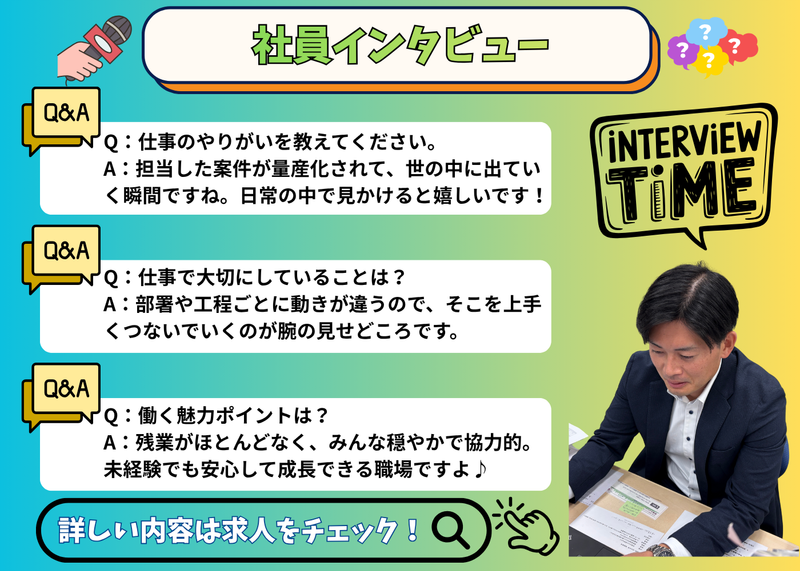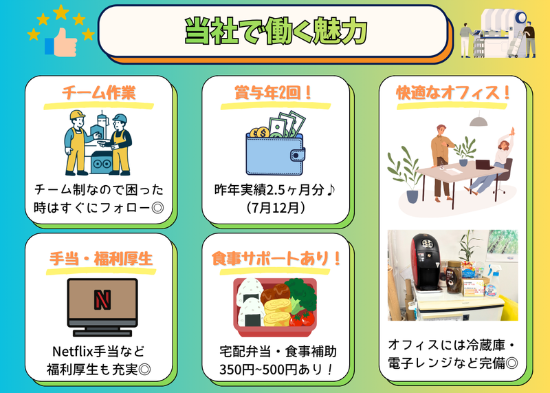 求めている人材 \\未経験スタート大歓迎!// 業界やプロジェクトマネージャー経験がなくてもOK! 実際に製造現場から営業へキャリアチェンジした先輩など、未経験入社の社員が多数活躍中です! もちろん経験者は即戦力として活躍できます✨ 先輩たちのサポートがあるので、安心して一歩ずつ学びながら成長できる環境です! ≪こんな方にピッタリ!≫ ■人と関わるのが好きな方 ■チームで協力しながら進める仕事がしたい方 ■コミュニケーションを大切にできる ■ものづくりに興味がある方 ■段取り・調整・スケジュール管理が得意な方 ■新しいことに挑戦するのが好きな方 ■安定した環境で長くキャリアを築きたい方 など お気軽にご応募ください♪
