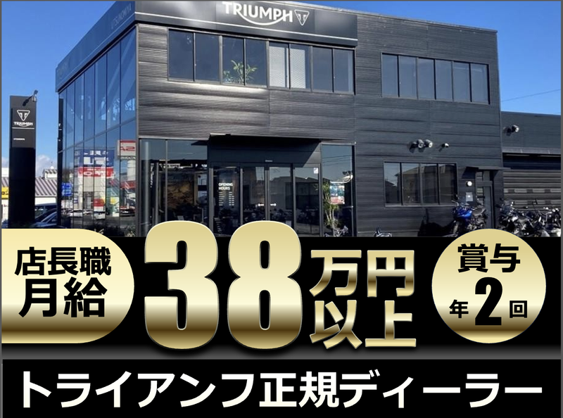 仕事内容 好きなバイクのその“先”を目指す \トライアンフ店長を募集中/ ◎アピールポイント◎ ✅創業1902年。世界最古級のバイクメーカー「トライアンフ」の正規ディーラー ✅連休取得可能/完全週休2日制 ✅月額38万~/賞与年2回 ✅高級車を多く取りそろえた中古車ショールーム! ✅育成・売上管理など、多岐にわたる業務を通して幅広い経営経験が積める! 【企業概要】 当社は、世界最古のオートバイメーカーとして世界中から支持を集める、英国高級二輪車ブランド「トライアンフ」の正規ディーラーです。 現在、茨城・栃木・柏・埼玉川口の4拠点に店舗を展開しており、各地域でトライアンフの魅力を発信し続けています。 「バイクが好き」「ブランドの世界観に共感できる」―― そんな想いをお持ちの方と、一緒にトライアンフの魅力を広めていけることを楽しみにしています。 【業務内容】 店舗の運営管理やスタッフのマネジメントを中心に、部門全体をリードしていただくポジションです。 高級輸入車という特別な商品を扱うため、上質なサービスとチームワークが求められます。 お客様対応から売上管理まで幅広く携わり、店舗全体を牽引する存在としてご活躍いただきます。 <具体的な業務内容> ・スタッフの採用・育成・管理(チームマネジメント) ・店舗の売上計画・目標設定・予算管理 ・備品の発注やコストのコントロール ・マーケティング施策の実行(キャンペーンやプロモーションなど) ・車両の修理・整備後のフォローアップ(試乗や納車など) ・クライアントへの進捗連絡(車両の状態など) ・他部門(整備・営業など)との連携、調整業務 ・本部や経営層とのやり取り(店舗運営に関する報告・提案) 「現場の運営」と「人のマネジメント」を両軸で行いながら店舗の成長を支えていく、やりがいのあるお仕事です! 【大切にしていること】 私たちは「ES(従業員満足)」「CS(顧客満足)」「CX(顧客体験)」の3つを大切にしています。 特に、ES(従業員満足)では、社員一人ひとりが夢や目標を持ち、前向きにチャレンジできる環境づくりに力を入れています。学びの機会や成長のサポート体制も充実しており、「豊かな人生」を歩めるよう応援しているので、安心して長く働ける環境が整っています。 また、車の販売や整備だけでなく、お客様の趣味やライフスタイルに寄り添ったイベントや体験型サービスにも力を入れており、CS・CX(お客様の満足と体験価値)を大切にしています。