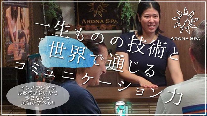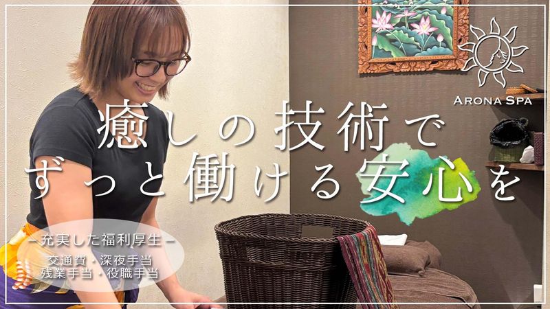 仕事内容 / 研修費用ゼロでプロへ☆ 未経験からでも安心スタート♪ \ 【 具体的なお仕事内容 】 *アロマトリートメント・リンパドレナージュ *フェイシャル・ヘッドスパ・ボディケア *もみほぐし・ストレッチ施術 *カウンセリング・受付・電話対応・予約管理 *店内美化などサロン運営業務全般 など 施術は“オールハンドのオリジナル技術”が中心!! 丁寧なカウンセリングをもとに お客様一人ひとりの疲労度や お好みに合わせたケアを実施。 施術後のアフターカウンセリングまで大切にし、 「明日もまた頑張れそう」と 笑顔になっていただける お店づくりを心掛けています。 ━━━━━━━━━━━━━━━━━━ ** ARONA SPAについて ** 渋谷駅から徒歩5分の 南国リゾート風×リラクゼーションサロンです!! 店内はアロマの香りに包まれ、 都会にいながら非日常を感じられる 癒しの空間。 >>未経験からプロへ育成! 約3週間の研修で基礎から丁寧に指導いたします! だから「全くエステの知識もない!」 なんて方も個々のレベルに合わせた カリキュラムで無理なく習得できます◎ >>ノルマなしでのびのび成長! 個人ノルマは一切ありません。 「お客様満足」を第一に考えた接客ができるため、 プレッシャーなく技術向上に集中できます♪ >>キャリアアップ可能! アルバイトから正社員登用制度も可能です! 意欲次第で副店長…店長へとステップアップも!? "エステの道を極めたい"なんて方にも ピッタリです◎ ▽ ▽ < 最後にARONA SPAから皆様へ > 当店では未経験から始めた方も多数在籍中です。 大切なのは「癒したい」という気持ちです。 仲間と支え合いながら、 一流のセラピストを目指しませんか? ぜひ気になることがあれば”個別面接”でお話しましょう!! あなたのご応募を心よりお待ちしております☆