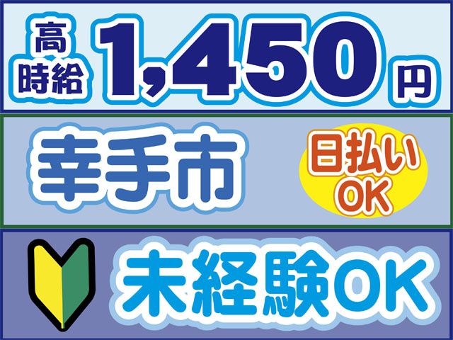 仕事内容 製品の組立スタッフ大募集! 〇初心者の方も安心して始められます 【組立スタッフのポイント】 〇単純作業×もくもく作業 〇未経験OK 〇時給1,450円スタート 〇日勤のみ 〇うれしい土日祝休み 〇残業ありで稼げます! 〇20代30代40代50代前半の男性活躍中 〇履歴書不要 〇交通費支給(規定内) 〇日払いOK(規定内) 〇職場見学OK(30分~1時間程度) 〇「マイリク定着支援」導入企業! 【組立スタッフの仕事内容】 幸手市にある住宅建材の製造工場でのお仕事。 バルコニーの部材を機械にセットし、 ボタンを押す作業をお任せします! 特別な経験は必要ありません。 やる気があれば未経験OK! 高時給×残業でとにかく稼げます!! 職場見学(30分~1時間程度)を実施しております。 【組立スタッフの勤務について】 〇8:30~17:45(実働7時間45分) 〇土日祝休み 急な発熱・体調不良・冠婚葬祭など、 突発的なお休みに柔軟に対応しております。 【こんな経験活かせます!】 下記経験者は前職活かせます。 〇軽作業パート・アルバイト 〇倉庫内派遣 〇主婦・主夫パート(職種不問) 〇中高年パート 前職不問で採用しております。 ブランクある方もOK、経験の浅い方もOK 〇ご不明な点はお気軽にお問い合わせください〇 お電話でのご応募、ご質問も受付中! 株式会社ロフティー 白岡支店 担当営業、または採用担当まで TEL0800-222-6888(フリーダイヤル) ↓お仕事情報など採用ページはこちら https://entori.jp/lofty-shiraoka コーディネーター・定着支援のWサポート体制導入 「マイリク定着支援」導入企業! アンケートで職場の様子を確認し、 コーディネーター・定着支援担当が連携してサポート。 はじめての派遣でも安心して働けるよう迅速かつ 丁寧にサポート対応いたします。