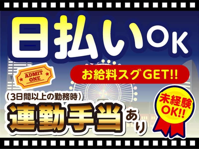 仕事内容 ★⌒・.・*★⌒・.・*★⌒・.・*★⌒・.・*★⌒・.・* 日本最大級! オープンシアターイベント開催 @ワールドポーターズ 5/2(土)・3(日)のGW限定 ⌒・.・*★⌒・.・*★⌒・.・*★⌒・.・*★⌒・.・*★ ワールドポーターズや MARINE & WALK YOKOHAMA パシフィコ横浜 など 横浜を代表する人気エリアで堂々行われる オープンシアターイベントが 今年も開催決定! “様々な映画をテーマにした体験”が楽しめる 日本最大級のシネマフェスティバル この激レアイベントを 一緒に盛り上げてくれる仲間を大募集! ◆具体的には  ̄ ̄ ̄ ̄ ̄ ̄ 5/2(土)・3(日)のGW限定! ワールドポーターズで行われる オープンシアターイベントでのお仕事 ・来場者の受付や誘導、案内 ・整備 ・設営撤去作業 など イベント運営の補助業務をお任せします ◎簡単なお仕事なので イベント未経験の方でもOK! / 映画好きも横浜好きも イベント好きも短期バイトしたい人も お友だちを誘って今スグGO!!! \ ◆他、勤務地あり  ̄ ̄ ̄ ̄ ̄ ̄ ̄ ̄ ◎MARINE & WALK YOKOHAMA ・5/2(土) 08:00~22:00 ・5/3(日)~5(火祝) 14:00~22:00 ・5/6(水祝) 14:00~23:00(終電まで) ⇒横浜市西区 横浜市中区新港1丁目-1 ⇒「馬車道駅駅」「日本大通り駅」 から徒歩9分 ◎パシフィコ横浜 ・5/4(月祝) 08:00~22:00 ・5/5(火祝) 11:00~23:00(終電まで) ・5/6(水祝) 07:00~13:00 ⇒横浜市西区 みなとみらい1丁目1-1 ⇒「みなとみらい駅」から徒歩5分 ◆POINT  ̄ ̄ ̄ ̄ ◇日払いOK ◇交通費(エリア手当)支給 ◇お友だちと一緒に勤務も大歓迎 お気軽にお問い合わせ下さい◎ ――――――――――――――――――― < 履歴書不要 > 履歴書不要で登録OK♪ 登録会も毎日開催しています◎ 即日勤務を希望の方も お気軽にご相談下さいね☆ ――――――――――――――――――― < 当社を少しだけご紹介 > あらゆる角度で イベント現場をサポート! ・イベント ・キャンペーン ・展示会 ・セミナー などの 企画制作や運営業務から ・各種イベント事務局運営 ・キャスティング業務 まで イベント関連の 幅広い業務を行う企業です!