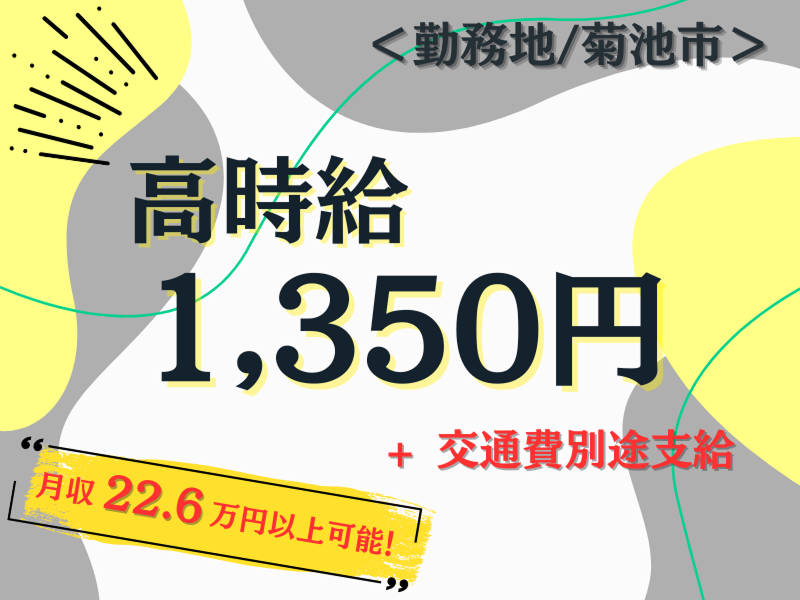 アピールポイント: :+:+:-:+:-:+:+:-:+:-:+:+:-:+:-:+:+: 【菊池エリア屈指の高時給】 事務職で時給1,350円! 効率よくしっかり稼ぎたい方に最適です。 【柔軟な働き方】 基本は8:00~17:00のフルタイムですが、 9:00〜16:00などの時短勤務も相談可能。 お子様の送迎や家庭の用事とも両立しやすい環境です。 【充実の福利厚生】 入社祝い金3万円(規定あり)や、 急な出費に助かる週払い制度も完備しています。 【長期休暇もバッチリ】 GW、夏季、年末年始の休暇があり、 年間休日は117日。 オンとオフのメリハリをつけて働けます。 :+:+:-:+:-:+:+:-:+:-:+:+:-:+:-:+:+: