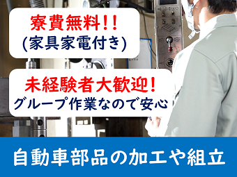 仕事内容 \寮費無料!時給1350円以上!/未経験からスタート多数!20代~50代までの幅広い年代の男女スタッフが活躍中の職場です★簡単・軽作業の組立・加工業務! <仕事内容> ■手のひらサイズ部品の組立マシンオペレータにて部品の組立業務 ※部品を機械にセットして簡単なボタン操作・検査 完成品でも手のひらサイズで2kgの重さ、重量物を使うことはありません。 具体的にはカーエアコン用のコンプレッサーの部品加工及び組立になります。 ■加工工程:部品を加工機へセットする。出来上がった製品の検査。加工機のメンテナンスを行っていただきます。 ■組立工程:コンプレッサーの組立。ライン作業です。重たいものを扱う事もなく、未経験でもできる簡単、軽作業です。 立ち作業でのお仕事です。 グループ作業となります。 《環境》 ロッカー有り|休憩室完備 アピールポイント <仕事内容> ■手のひらサイズ部品の組立マシンオペレータにて部品の組立業務 ※部品を機械にセットして簡単なボタン操作・検査 完成品でも手のひらサイズで2kgの重さ、重量物を使うことはありません。 具体的にはカーエアコン用のコンプレッサーの部品加工及び組立になります。 ■加工工程:部品を加工機へセットする。出来上がった製品の検査。加工機のメンテナンスを行っていただきます。 ■組立工程:コンプレッサーの組立。ライン作業です。重たいものを扱う事もなく、未経験でもできる簡単、軽作業です。 立ち作業でのお仕事です。 グループ作業となります。 《環境》 ロッカー有り|休憩室完備 \充実した福利厚生/ ◎社会保険・雇用保険完備 ◎有給休暇有(6ヶ月経過後、10日付与)※規定あり ◎残業手当 ◎交通費支給(規定内) ◎確定拠出年金制度 ◎週払い制度(週3回対応) ◎お友達推薦制度あり(規定有り) ※1名につき3万円~10万円臨時給与として支給 ◎車(マイカー)通勤可(無料駐車場あり) ◎寮完備 ◎制服貸与 ◎食事持参可 ◎社員食堂あり(仕出弁当あり) ◎ロッカー・休憩室利用可 ◎福利厚生プログラム (宿泊、グルメ、ショッピングなど大幅割引が受けられる10万アイテムのメニューがあります。)
