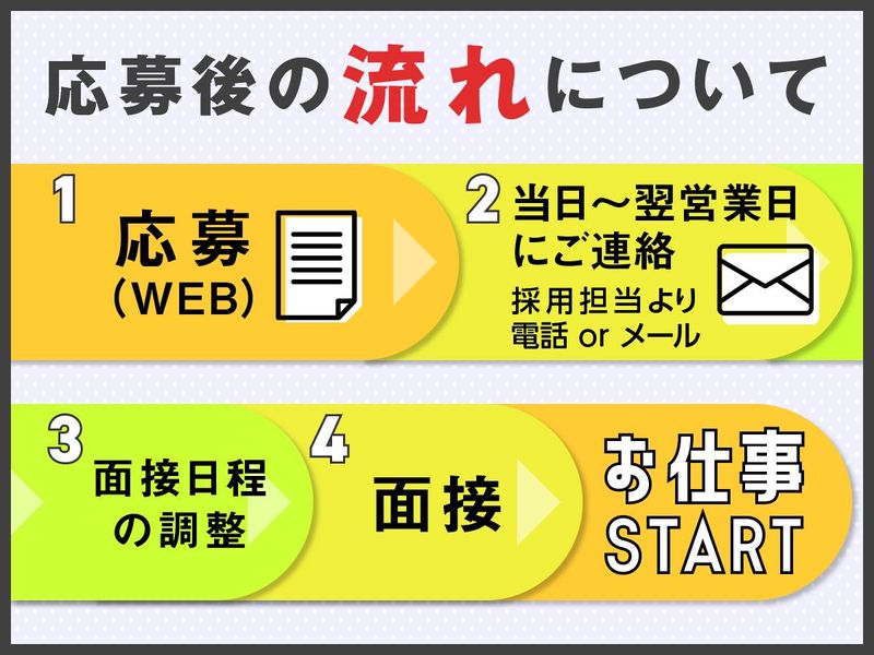 選考プロセス <WEBでのご応募> 24時間、応募受付中! 必要事項を記入のうえご応募下さい。 担当者よりご連絡させて頂きます。 <お電話でのご応募> 「名古屋のマイナンバーの 広告を見ました」と言って頂けると スムーズにおつなぎできます。 お電話がつながりにくい場合は WEBよりご応募ください。 <応募後の流れについて> [1] 応募(電話orWeb) ↓ [2] 当日〜翌営業日にご連絡 電話 or メール(採用担当より) ※【0120-717-639】より お電話いたします。 ↓ [3] 面接日程の調整 ↓ [4] 面接 勤務地にて、面接会を開催します! ↓ [5] お仕事スタート! ⭐詳細はお気軽にお問い合わせください。