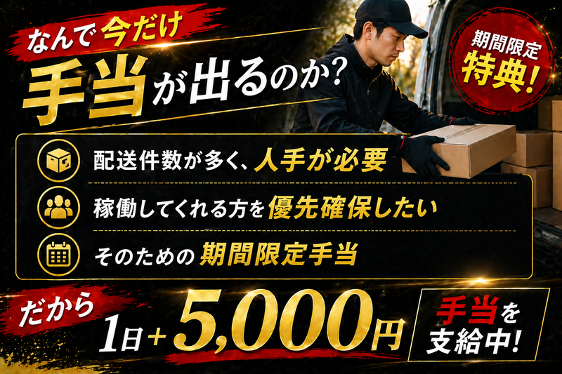 仕事内容 ============== ✨ 結果が収入に直結する仕事 ============== 今だけ特典あり ⭕ 1日あたり5,000円手当を上乗せ中 「頑張っても給料が上がらない」 そんな働き方から抜け出したい方へ。 この仕事は、やった分だけ収入に直結する配送パートナーです。 ■ この仕事の特徴 ◇ 直行直帰OK ◇ 週払い対応OK 無駄な時間を削り、収入に集中できる環境です。 ■ 稼ぎやすい理由 ◇ 配送エリアがまとまっていて回りやすい ◇ 長距離移動が少なく効率的に稼働できる ◇ 安定した配送件数を確保しやすい 効率よく動けるため、行動量をそのまま収入に変えやすい仕事です。 ■ 収入を伸ばせる仕組み ◇ 配送件数に応じて報酬が決定 ◇ 稼働量がそのまま収入に反映 ◇ 回り方の工夫で収入アップ さらに現在は ◇ 1日5,000円手当を支給中 通常よりも短期間で収入を伸ばしやすいタイミングです。 ⏩️ 業務内容 ネット通販商品(小型家電・日用品・雑貨など)を配送 ■ 仕事の特徴 ◇ 置き配が中心 ◇ 再配達の負担が少ない ◇ 対面ストレスが少ない ◇ 一人で完結できる業務 人間関係に左右されず、 自分のペースで稼働できます。 ⏩️ 稼働の流れ 自宅から倉庫へ直行 ⭕ ↓ 荷物を積み込み ↓ 担当エリアを配送 ↓ 終了後はそのまま帰宅 ⭕ 出社のための往復なし 時間を効率的に使えます ■ 報酬について 報酬は稼働量により決定 ◇ 継続して稼働すれば月収60万円も可能 ◇ 週払い対応あり 現在は ⭕ 1日5,000円手当あり ■ この仕事に向いている方 ◇ 頑張りを収入で実感したい ◇ 固定給では満足できない ◇ 人間関係に疲れている ◇ 一人で集中して働きたい ✨ この仕事のスタンス これは「雇われる働き方」ではなく、 自分の行動で収入を作る働き方です。