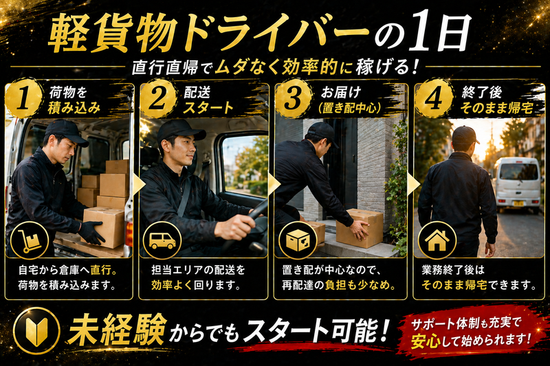 求めている人材 【応募条件】 普通自動車免許(AT限定可) 経験・学歴・年齢、すべて問いません。 必要なのは「真面目に取り組む姿勢」だけ。 【こんな方に向いています】 配送の仕事は、意外と“自由”で“気楽”。 こんな想いを持つ方なら、きっとハマります。 ・人付き合いに気を使う職場が苦手 ・コツコツ一人で進めるのが好き ・接客より運転が性に合っている ・時間に追われず、マイペースで働きたい ・安定収入も、自由な働き方もどっちも欲しい 【こんな人が活躍中】 元営業、元接客、元工場スタッフなど、 まったくの未経験から始めた方が多数。 「人と話すより、ハンドルを握るほうが落ち着く」 そんなタイプの方が長く続けています。