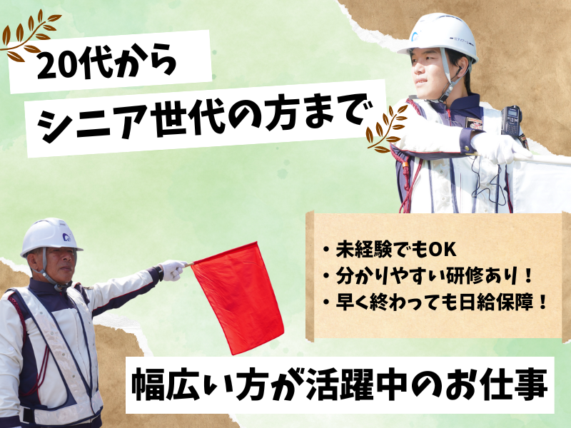 試用期間あり 試用・研修期間:3日(20時間) 試用・研修期間の条件:給与条件が異なる 【10月1日から研修費UP!】 ※総額2万2800円(時給1140円×20h) <研修について> 座学や外での旗振り練習など、 イチから丁寧に教えるので、 未経験スタートの方も安心してください。 【給与】 本採用と異なる 基本給 : 時給 1140円