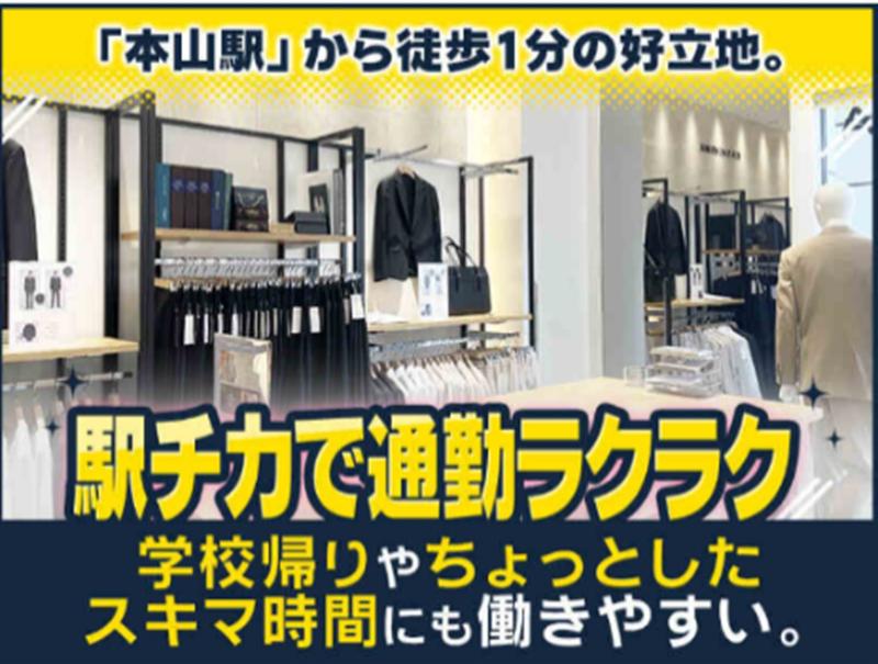 アピールポイント: 【週2日/1日3h~】 シフトの融通バツグン! 10:30~20:00の間で、 あなたの予定に合わせて働けます。 ✅16:00~20:00(学校帰りに) ✅10:30~16:00(夕飯の支度まで) ◎シフトは2週間ごとの提出で予定が立てやすい! 【未経験・学生・主婦活躍中】 スーツの知識は一切不要! まずは簡単な業務からスタート。 接客中も先輩が隣でサポートするので安心です ◎卒業が決まった高校3年生も活躍中♪ 【KASHIYAMAとは?】 20代~30代に人気の オーダーメイドスーツ店です。 1着3万円~の高品質なスーツ作る 全国にお店を展開するブランドです。