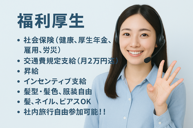 求めている人材 \未経験・バイトデビューOK/ あなたのやる気・挑戦を応援◎ まずは「やってみたい」 その気持ちがあればOKです♪ 扶養内での勤務もOK◎ ★学生・主婦(夫)・フリーター歓迎 ★経験の浅い方OK ★20から40代スタッフ活躍中! ★経験者優遇◎ ▼こんな方にオススメ! #コミュニケーションが好きな方 #チームワークを大切にできる方 #真面目にコツコツ頑張れる方 #フルタイムでしっかり稼ぎたい方 #スキマ時間を有効活用したい方 #スムーズにPC (ローマ字打ち) 入力ができる方 ◇ガッツリ稼ぎたい方、扶養内で自由に働きたい方等 どんな働き方でも大歓迎です!