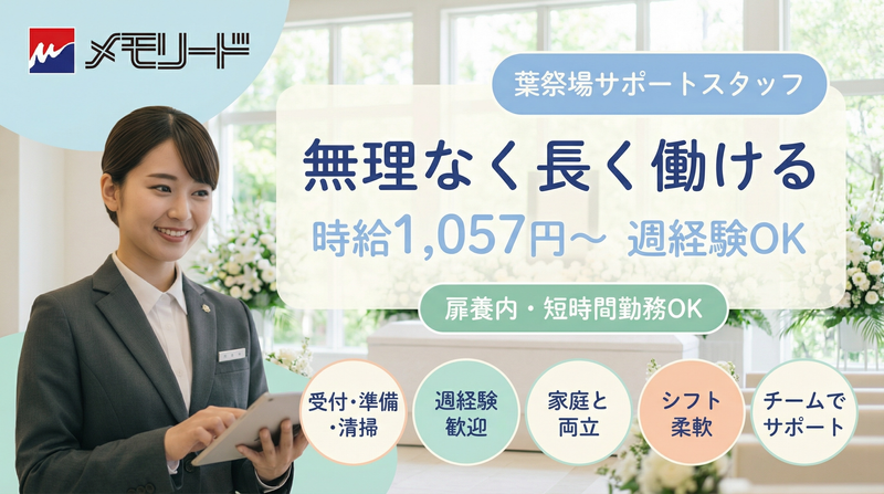職場環境 落ち着いた雰囲気の葬儀場で、チームで協力しながら進める職場です。 未経験スタートのスタッフも多く、受付・準備・清掃など、できることから担当。 業務は分担制で体力的な負担も少なめ。時間や日数の相談もしやすく、男女問わず50代も活躍中です。 喫煙所:喫煙所あり(屋外)