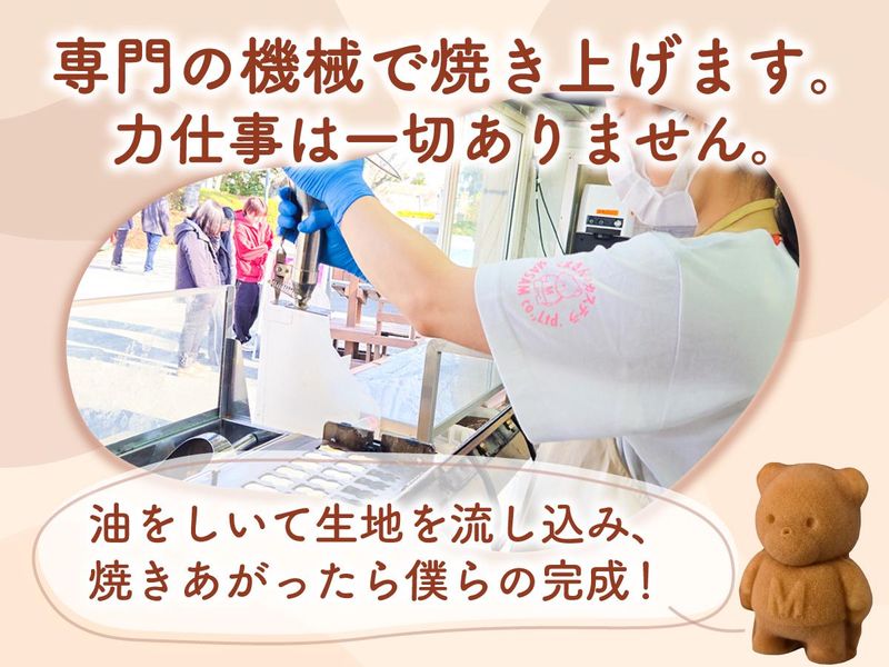 仕事内容 東武動物公園内の店舗にて 「くまさんのカステラ」の 製造・販売・店舗運営全般をお任せします。 生地の仕込みから焼き上げ、接客、 在庫管理まで幅広く携わるお仕事です。 単に商品を売るだけでなく、 原材料の管理から「職人の技」が必要な 製造工程、そして店舗の数値管理まで。 一つの店舗を動かす「経営」に近い 視点が身につく環境です。 ⭐1. 生地の仕込み・製造 会社から提供される来場者予想データと 当日の天気や気温など 肌で感じたことをもとに 仕込みの量を決めていきます。 卵を一つひとつ割り、 独自のミックス粉や香料を正確に計量し、 ミキサーで生地を練り上げます。 焼き上げ: 専用の機械を使用しますが、 実は「油の塗り方」や 「生地を落とすタイミング」で 仕上がりが全く変わります。 1〜2ヶ月かけて「外はサクッ、中はフワッ」 とした最高の状態を安定して 作れる技術を磨きます。 ⭐2. 販売・接客 五感に訴える演出: ガラス張りの店内で、 焼きたての香りと共にお客様へ提供します。 状況に応じた気配り: お子様連れや ベビーカーのお客様には ビニール袋を添えるなど、 マニュアルを超えた「状況判断」を とても大切にしています。 ⭐3. 店舗管理・運営 アルバイトスタッフの管理全般。 簡単なPC操作があります。 資材の運搬: 園内の事務所に届く資材を、 軽トラックを運転して 各店舗(約2kmの範囲)へ運びます。 *…*…*…*…*…*…*…*…*…* ✅力仕事はありません ・仕込みの粉も女性一人で持てるほど 小分けにされています。 ✅クレームもほぼありません。 ・遊園地という非日常空間だから、 クレームやお客様からの苦情は 年間通じてほぼありません。 ✅最高のパフォーマーであれ。 ・商品を渡してお会計までほんの数分、 その間いかにお客様(子どもたち)の 印象に強く残るか。 やさしく語りかけられるか。 ✨「店長」を目指せるキャリアパス! 充実した育成・フォロー体制があるため 店長へステップアップ! あなたの成長と貢献を正当に評価し、 還元します。 ■店長・岩井さん(在籍14年)より■ 目の前で焼き上がっていくカステラを見て、 お子様が目を輝かせて待っていてくれる。 手渡した瞬間に『ありがとう!』と 笑顔で手を振ってくれる。 そんな非日常の幸せに毎日触れられるのが、 この仕事最大の魅力です。 平日は一人でお店を回す 『ワンオペ』の時間もあります。 行列ができる中で、カステラを焼きながら 接客もこなす。最初は段取りが分からず プレッシャーでしたが、 必死に食らいつくうちに自分なりの 『リズム』が掴めるようになりました。 忙しさの先にあるお客様の笑顔が、 何にも代えがたい報酬でしたね。