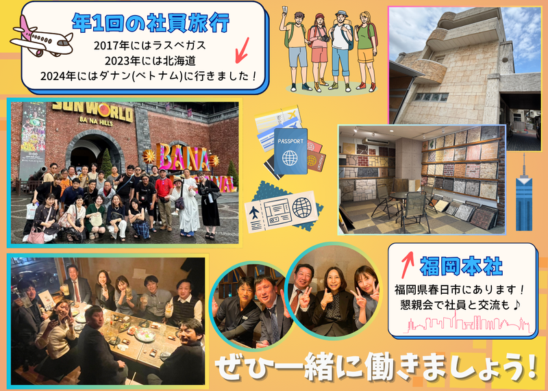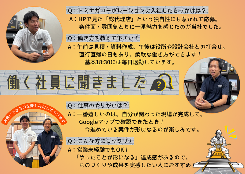 仕事内容 \\営業経験を“街づくり”に活かす!// ★福岡発、日本を変える営業へ★ 「ストリートプリント工法」日本唯一の総代理店! ✅トミナガコーポレーションとは? 私たちは、アスファルト舗装にレンガ調や石畳調のデザインを施す「ストリートプリント工法」の日本唯一の総代理店です。 加熱した舗装に型押しを行い、専用塗料「ストリートボンド」で着色することで、美しさと耐久性を兼ね備えた景観を生み出します。 ✅働きやすさが満載!◎ ✨年間休日124日 × 土日祝休み! 長期休暇もしっかりあり、オフの時間も充実できます◎ ✨賞与年2回+決算賞与あり! 業績に応じてしっかり還元。7年連続で支給実績あり! ✨SNSでも会社の雰囲気を発信中! 事前に雰囲気を確認してから応募もOK! ========================= ■HP/YouTube【トミナガコーポレーション株式会社】で検索 ■Instagram『tominaga_corp』 ■X(旧Twitter)『@tominagaCorp』 ========================= ✅次のステージは「売上50億・海外進出」へ トミナガは今、まさに事業拡大の真っ只中。 2030年には「売上50億円・社員50名・海外展開」を達成するというビジョンを掲げ、 単なる建設会社ではなく、「景観で街を変える専門企業」として進化を続けています。 その中で、福岡本社は“全社の成長をリードする中核拠点”として、 単なる営業ではなく、考えて動く“営業”の力を求めています。 ✅建設業界では珍しい!残業ほぼなしの働き方 ・先輩社員の中には子育て中のメンバーも多数! ・家庭との両立がしやすく、定時退社が当たり前の職場風土です。 ✅まずは福岡密着で安心スタート! ・入社後は福岡エリアを中心に担当していただき、営業スキルをしっかり身につけていただきます。 ・経験を積んだ後には、希望や適性に応じて県外案件をお任せする可能性もあります! ✅仕事内容  ̄ ̄ ̄ ̄ ̄ ̄ ⏰具体的な仕事内容(業務の流れ)⏰ ◆①顧客リスト作成 建設新聞や役所のHPから工事計画をチェックし、月に30~40件程度をリストアップします。 問い合わせベースの対応も多く、新規アポイントに不安がある方でも始めやすい環境です! ▼ ◆②訪問・情報収集 福岡県内の自治体や工事会社を訪問(直行直帰OK)。 1日あたり4~5件、各現場で担当者と30分ほど会話し、信頼関係を築きます。 ▼ ◆③見積り作成・受注サポート 設計会社や公共機関と連携し、見積の作成・提出を行います。 また、道路工事会社からの依頼対応や入札状況の確認なども担当します。 ▼ ◆④受注後の打ち合わせ 受注先の工事会社と施工内容やスケジュールについて打ち合わせを行います。 ※施工業務は社内の専任スタッフが担当するため、営業職は現場作業に携わりません。 ▼ ◆⑤工事完了後のフォロー 工事完了後に現場を訪問し、仕上がりや評価を確認。 次回の案件につながるよう、信頼構築を大切にしています♪ 福岡市内をはじめ、全国で導入が進む注目の技術! 希少な工法を活かして、街づくりに貢献できる仕事です。 自分の提案が“街の景観”というカタチで残る—— 成果が目に見えて分かる、やりがいの大きなポジションです! ≪最近の主な施工実績≫ ・東京タワー ・JR新宿東口 ・櫛田神社表参道 ・博多駅バスセンター周辺など 全国のシンボル的な場所にも取り入れられています! ✅働く社員にインタビュー  ̄ ̄ ̄ ̄ ̄ ̄ ̄ ̄ ̄ ̄ ̄ ̄ ̄ (Nさん/2024年6月入社/島根県出身) (Oさん/2023年7月入社) Q:入社のきっかけを教えてください! 【⏬Nさん】 前職は日用品メーカーで営業をしていましたが、商品の“薄利多売”に限界を感じていました。 「競合が少なく、独自性のある商材で勝負したい」と思っていた時に、偶然HPで当社を見つけたんです。 直接メールで応募し、面接を受ける中で、 ——「これまでの営業経験が活かせる」「商材が覚えやすい」「収入アップも期待できる」—— この3点が決め手となり、入社を決めました。 【⏬Oさん】 地元のハローワークで当社の求人を見つけ、興味を持ったのがきっかけです。 その後、HPに掲載されていたYouTube動画を見て、実際の施工風景や社内の雰囲気がよく分かり、 「ここで働いてみたい!」という思いが強くなりました。 前職(外装・インテリア系)の経験も活かせそうだと感じており、他社も並行して受けていましたが、 条件面・会社の雰囲気ともに、最も魅力を感じたのが当社でした。 Q:入社後の印象は? 【⏬Nさん】 面談時に、採用担当の方が同業出身だったこともあり、こちらの不安や悩みにしっかり共感してくれて安心感がありました。 選考もとてもスピーディーで、社長や役員との距離感の近さや、会社の将来性にも惹かれました。 前職よりも年収が上がったことも嬉しかったです。 未経験の業界だったので、商流や営業スタイルには苦戦しましたが、今では日々の成長を実感できています。 【⏬Oさん】 入社後すぐに仕事に入ることができ、スムーズなスタートが切れました! 午前中は見積作成や資料づくり、午後は役所や設計会社との打ち合わせがメイ