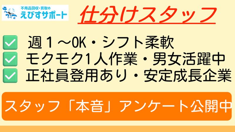 仕事の内容 「週1から働けて、時間に融通が利く職場ないかな?」 「副業、Wワークで、稼ぎたい!」 「一人でもくもくと作業するのが合ってると思う!」 「中古品が好き!仕事しながら中古品のプロになりたい!」 「ウソはつかない性格」が自慢! 「若い社長が率いる、成長中の会社で働きたい」 「 風通しが良い雰囲気の職場で働きたい!」 「人間関係が良い職場で働きたい!」 「頑張って正社員を目指したい!」 「自分が得意なことを活かせる環境がいい!」 もし、これらの中に1つでも該当することがあって、「何か、良い職場ないかな?」って探しているなら、この求人がお役に立てるかもしれません。 なので、チョット、読んでいってもらえれば嬉しいです。 ー はじめまして、こんにちは! 株式会社EBSカンパニー代表の岡本です。 弊社は、リユース企業で、「まだ価値あるものを、必要な人にお届けする」という考えのもと、SDGs的観点で活動しています。 また、『EBSカンパニーで働いて良かったな』って、出会ったスタッフの方に思ってもらえる事を大事にしています。 ー それでは、「なぜ、弊社なら、あなたのお役にたてるのか?」について、その理由を、説明させていただきますね。 ちなみに、弊社は「パート職だって、フィットしない職場にいくのは辛い」「だからこそ、しっかりと情報開示すべき」と考えています。 ですので、この求人も、他の求人とは違って、長文になっています。 そのため、いっぺんには読めないかもしれません。 なので、いったん、こちらの求人を『お気に入り登録』いただいて、ゆっくり、じっくりお読みいただければと思います。 ー 【週1~OK】 「家庭事情で、水曜だけしか働けない・・」 「学校があるから、金曜だけならOKなんだけどな」 みなさん、「それぞれの生活」があるからこそ、こういった悩み、ありますよね。 うちは、あなたのライフスタイルに合わせて、働いていただけるよう、「週1~OK」という形としています。 ー 【シフト柔軟】 今回のポジションは、倉庫内での清掃や、リサイクル商品の仕分けがメイン。 ですので、「毎日〇時に必ず、いないとダメ」という性質の業務ではありません。 なので、あなたの「この日なら働けます」といったご相談にのれますよ。 ー 【副業・ダブルワークOK】 今回のポジションは、「ダブルワークで働いていただいてOK」。 ですので、「普段、引越しで働いてるけど、残業できなくなって、稼げなくなって、困ってる」といった方も、遠慮なく、ご相談いただければと思います! ー 【正社員を目指せる・年収400万可能】 今回のポジションは、パートではありますが、「やってみて、合ってたら正社員も考えてる」といった方も、OK。 実際、うちは、「アルバイトから入って、幹部になった」って人もいます。 また、正社員になって活躍頂けると、年収400万もめざせますし、実際、その位の若手スタッフもいます(サービス残業もないです)。 ー 【黙々と作業できる方にピッタリ】 今回募集するお仕事は、たとえば、以下のような様々な仕事をしていただきます。 「倉庫内でのリサイクル品の仕分け・分別」 「輸出品の検品、荷造り、梱包」 「輸出コンテナへの積み込み」 「トラック荷台から荷下ろし、積み込み」 「中型トラックでのリサイクル品の運搬(免許保有者のみ)」 最初は、マニュアルを見たり、同僚や先輩社員に聞いたりすることもあるかもしれませんが、慣れてきたら、黙々と作業をしてもらいます。 なので、「一人でもくもくと作業をすることが苦にならない人」にはピッタリだと思います! ー 【チームでカバーしあえる仕事】 今回募集するのは、倉庫内での様々な役割を担っていただくお仕事です。 しかし、それらを全て一人でやっていただく必要はありません。 チームでカバーしながら、仕事を進めます。 なので、自分が苦手な仕事であれば、「チームの他の人にカバーしてもらえる環境」です。 例えば、重たいものを1人で運べない場合はもう一人がサポートします。 「一人で何とか頑張れ」と放置することはありません。 このように、自信が無いことであっても、 まわりの仲間とフォローしあいながら進めていけるお仕事です。 ー 【お仕事のイメージ】 ・リユース、リサイクル品の分別、仕分け ・リユース、リサイクル品の梱包 ・リサイクル品の仕向け先への運搬(必要免許ある方のみ) ・輸出品のコンテナ積み込み ・倉庫内清掃 ー 【1日のお仕事の流れ(例)】 08時00分:朝礼・清掃 09時00分:リサイクル品の積み込み 10時00分:リサイクル・リユース品の仕分け・分別 12時00分:お昼休み 12時45分:リサイクル・リユース品の仕分け・分別 14時30分:リユース・リサイクル品の梱包 17時00分:今日のお仕事終了! ー 【適材適所に配置可能な職場】 繰り返しになりますが、お仕事のすべてを1人で担当していただく必要は無く、チームで分担していただくことが可能です。 なので、例えば、「めっちゃ力あるけど、中型免許は無