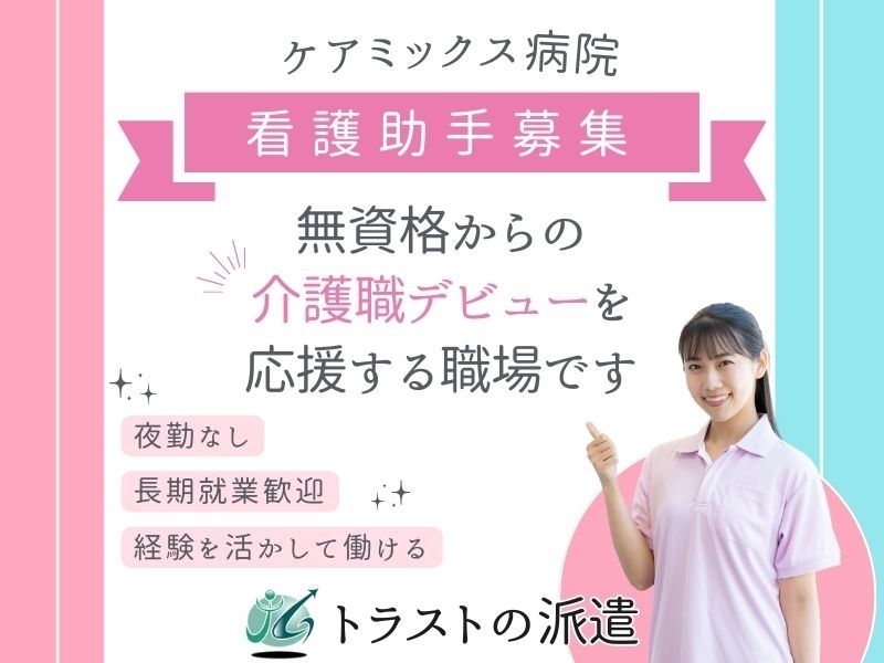仕事内容 \ ケアミックス病院での「看護助手」スタッフ募集 / 【仕事内容】 療養病棟における介護業務全般 ・食事介助 ・入浴介助 ・排せつ介助、おむつ交換 ・環境整備、移動介助 ・備品管理、記録業務 ・看護師の処置補助 など 【派遣先】 岩切病院(宮城県仙台市宮城野区岩切字稲荷21) 定員100床/療養病棟(58床)、一般病棟(42床) ※派遣スタッフは療養病棟配属 まずはお気軽にお問合せください! ★登録時はメールやLINEで履歴書のやりとり可♪履歴書の写真を撮って送るだけでもOK! ★顔写真不要です♪