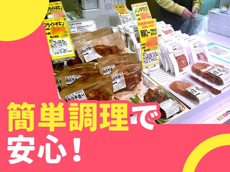 仕事内容 ―――――この求人のポイント!――――― ◆未経験の方も応援! ◆裏方でコツコツ作業が好きな方に◎ ◆週4日~勤務で安定して稼げる! ◆主婦さん多数活躍中!子育て世代も安心の環境 ◆社員割引あり♪ 仕事後にそのまま買い物もできて嬉しい♪ ◆社員割引あり♪ ―――――――――――――――――――― お肉の専門店「肉のあまいけ」のお惣菜部門でのお仕事です。 レジ業務はなし◎ ★具体的には★ ・お惣菜の仕込み作業 ・お弁当やお惣菜の盛り付け ・簡単な調理補助 ・商品の品出し・陳列 ・パック詰め ・シール貼り などをお願いします! 【すぐ覚えられるモクモク作業!】 作業内容がとてもシンプルなので覚えやすく、 どなたでもなじみやすいお仕事です。 未経験OK、スキルも一切問いません。 研修もしっかり完備。先輩が優しくお教えします! 〇普段からコロッケなどの調理をされている方は経験を活かせます。 〇店舗ならではの料理のコツが身に付くので、ご家庭でも役立ちます。 <お仕事の流れ> 8:00:出勤 開店まで売場の商品作り→陳列 (お惣菜加工・パック詰め、値札貼りなど) 10:00〜12:00: 惣菜加工・パック詰めや陳列など 13:00〜16:00: 売場に足りない商品の補充や清掃など 16:00〜17:00: 片付けや翌日の準備をして終了! 先輩が横でフォローするので 「初めてのパートでも安心」と好評です。 ★主婦(夫)さんが多数活躍中★ フルタイム、午前だけなど あなたにあった働き方が可能です! 「子どもが学校に行っている時間に」 「家事とうまく両立しながら」 など、主婦さんが多数活躍中◎ ★嬉しい社員割引あり★ 夕飯のおかずに、ご家族へのお土産になど 美味しいお肉やお惣菜をお得に買えます♪ 「肉のあまいけ」はご家庭用の お肉を取り扱う専門店! 品質はもちろん、切り方や 盛り付けにもこだわっており、 ワクワクする売り場作りをしています♪ メニューや調理方法の ご案内も行っているため、 お仕事を通じて少しだけ お肉にも詳しくなれますよ◎