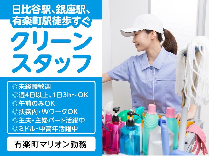 仕事内容 《お仕事内容》 ■ごみ回収 ■掃除機掛け ■モップ掛け ■トイレ清掃 など… 有楽町マリオンおよび、周辺建物敷地内および駐車場の清掃。 すぐに覚えられる簡単作業! 未経験の方にも丁寧に指導しますので、お気軽にご応募ください♪ 女性も活躍できる職場環境が整っております。