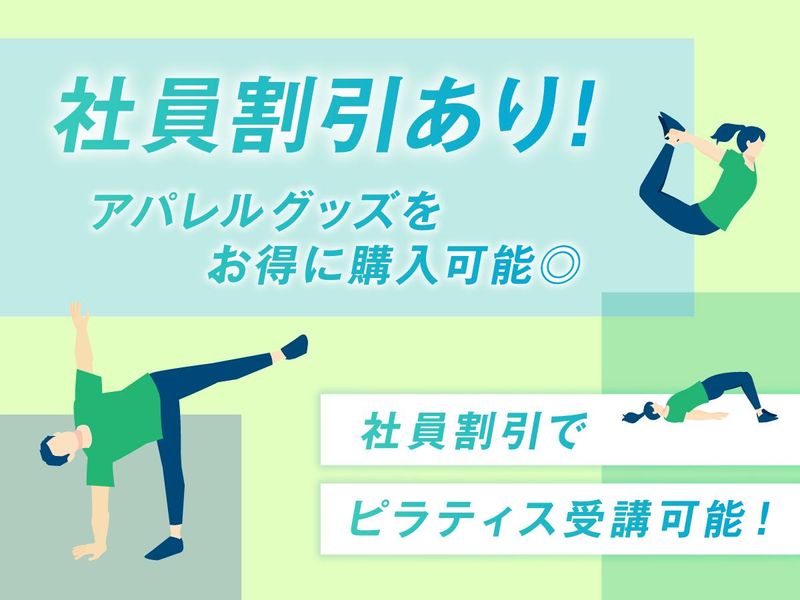【保険制度】 雇用保険、労災保険、健康保険、厚生年金 待遇・福利厚生 【福利厚生】 ■交通費規定内支給(上限2万円) ■制服貸与 ■社員割引あり L ピラティス受講可 L ピラティスアパレルグッズ購入可 ■社員登用制度