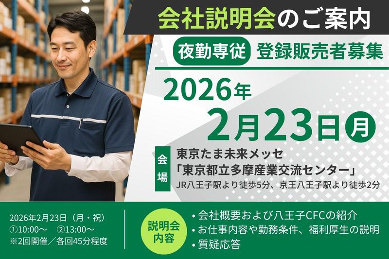 仕事内容 ◤ ̄ ̄ ̄ ̄ ̄ ̄ ̄ ̄ ̄ ̄ ̄ ̄ ̄ ̄ ̄ ̄ ̄ ̄ ̄ 2026年夏オープン予定!八王子CFC勤務 対面接客ゼロ✅深夜の裏方作業メイン! 登録販売者として新しい働き方に挑戦◎ ___________________◢ イオングループの新物流センター内薬局で、 医薬品管理・裏方業務を担当いただきます。 対面接客は一切なし! 商品の入荷・ピッキング・梱包・在庫管理、 販売データ処理などをコツコツ進める作業 がメインです。 ※弊社は1200SKUの医薬品を扱っています 他、管理薬剤師(上長)への報告や 問い合わせ対応などもありますが、 落ち着いた環境で実務に集中できますよ◎ 薬機法など関連法規を遵守しながら、 お客様に安心・安全な医療をお届けする 責任あるお仕事です! 「薬局勤務は好きだけど、対面接客を 減らしたい…」そんな方に最適◎ 資格を活かしてキャリアチェンジしませんか? *――――――――――――――――――* ┃こ ┃こ ┃が ┃ポ ┃イ ┃ン ┃ト ┗━ ┗━ ┗━ ┗━ ┗━ ┗━ ┗━ ⭐物流×薬局が一体化した新業態。 ⭐イオングループの安定基盤で安心感◎ ⭐少数精鋭のチームで裁量を持って働けます ⭐年間休日125日*プライベートも充実♪ ⭐夜勤専従ですが安定した働き方が叶います *――――――――――――――――――* < メッセージ > “お客さまの日常に時間と心のゆとりを 届け、社会をより良くすること” それが私たちイオンネクストのミッション。 自ら考え、導き、より良い仕組みを創る── そんなリーダーシップを発揮できる方を歓迎します。 管理者要件を満たしているあなたなら、 現場経験を活かした力が発揮できるはず♪ 「この仕事を続けたいけど、 今後ずっと立ち仕事は厳しい…」 「接客より裏方業務が好き」 そんな方が輝ける場所です! *――――――――――――――――――* <会社説明会のご案内> ✅開催日時 ◆2026年2月23日(月・祝) [1]10:00~ [2]13:00~ ※2回開催/各回60分程度 ✅会場 東京たま未来メッセ 「東京都立多摩産業交流センター」 JR八王子駅より徒歩5分、 京王八王子駅より徒歩2分 【説明会予定内容】 ・会社概要および八王子CFCの紹介 ・お仕事内容や勤務条件、福利厚生の説明 ・質疑応答 ※個人ごとの説明会は開催しておりません。 会社説明会にご参加いただくか、 直接選考に進んでいただくかの どちらかとなります。 説明会への参加をご希望の方も 本求人よりご応募ください。 後ほど案内のご連絡をさせていただきます。