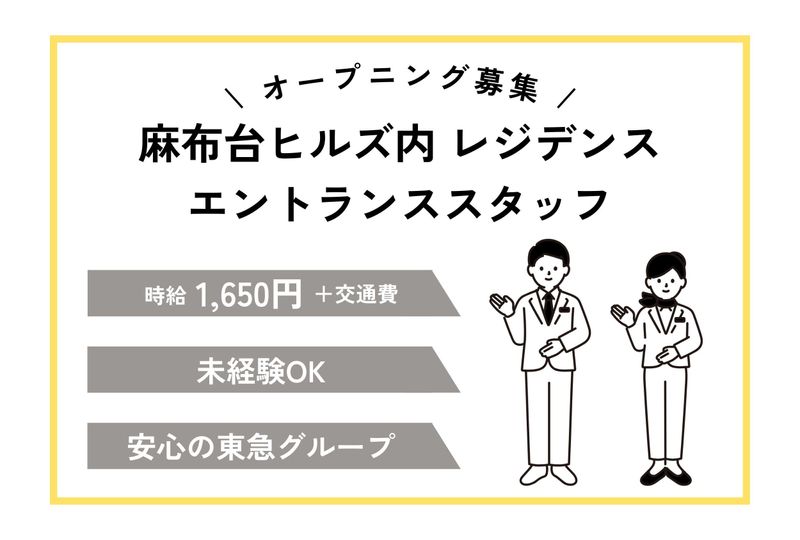 仕事内容 / 【オープニング募集】 麻布台ヒルズ内レジデンスの エントランススタッフ (ドア・ポーター業務) \ *常時3~4名体制で、 協力しながら行っていただきます 具体的には… <ドア業務>*屋外での勤務 ・居住者様、来訪者様の応対 (お出迎え、お見送りなど) ・タクシー等各種車両の 誘導案内および交通整理 (車寄せ利用時間、台数等) ・お荷物の積み下ろし <ポーター業務>*屋内での勤務 ・玄関、住戸間のお荷物運搬 (不在宅配等含む) ・フロント補助業務 ・台車回収 <共通業務> ・フロント、設備や警備担当者との連携業務 ・館内および周辺施設案内 ・月報作成 ・玄関周りの美観清掃 (清掃は別の担当が行うため、補助的に行います) *制服あり (以下はご自身でご用意いただきます) 男性:黒のビジネスシューズ 女性:黒の低ヒールパンプス ー ■□ エントランススタッフとは… □■  ̄ ̄ ̄ ̄ ̄ ̄ ̄ ̄ ̄ ̄ ̄ ̄ ̄ ̄ ̄ ̄ ̄ ̄ レジデンスの玄関で居住者様の お見送り・お出迎えや車両の誘導、 お手荷物の運搬や管理を行う サービススタッフのことで、 ドア・ポータースタッフとも 呼ばれます。 レジデンスの「顔」として、 居住者様の心地良い 居住空間づくりのプロとして 一緒に働く仲間を募集いたします! 勤務地は、2025年10月に開業した 〈麻布台ヒルズ〉内の高級レジデンスです。 30年の長い年月を経て、 オフィス・住宅・商業施設などが融合した 新しい街が誕生します。 地上64階の高さを誇る高級レジデンス。 あなたのおもてなしが、新しい街を担う 「今しかできないお仕事」です。 居住者様のお顔やお名前を覚え、 お互いを知るからこそ提供できる サービスの奥深さは この仕事だから得られる醍醐味!! ✅プライベートと両立!無理なく働く ご自身のスケジュールに 合わせた働き方が可能! また、適宜、水分補給を行うなど 動く仕事だからこその 働きやすい職場環境を用意しています。 ✅万全なサポート体制 最新のレジデンスの オープニングを飾る一員として活躍! 未経験の方にも安心して ご勤務いただけるよう、 専用の研修プログラムを用意しています! 当社が大切にしている おもてなしの接客スキルを しっかりと学ぶことができます。 もちろん、ドアマンやポーター業務の ご経験のある方も大歓迎! 他にはない新しい街のレジデンスで ご自身のスキルアップがかなう職場です。 ー 【研修について】 ・東急グループホテルのおもてなしについての座学研修 ・外部講師による接客研修 ・実務の動画研修 ・麻布台ヒルズでのレクチャーなど 少しずつ慣れながら一緒に活躍しましょう!