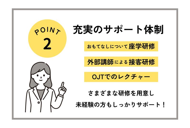 求めている人材 ・未経験OK ・社会人経験のある方 ・基本的なPCスキルのある方 《歓迎(経験の有無は合否に関係ありません)》 *ドア・ポーターのご経験がある方 *ホテルやマンションでのフロント経験のある方 *飲食店など接客業や警備業務のご経験のある方