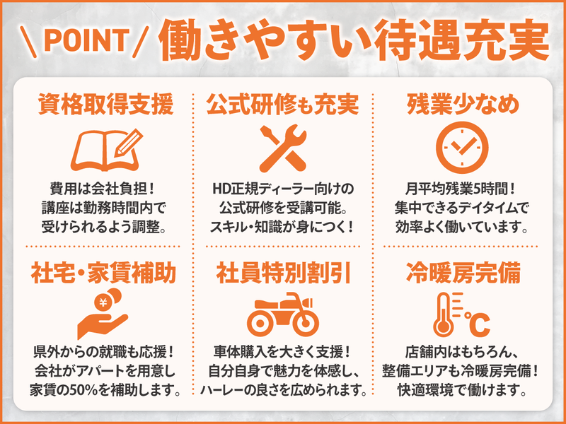 求めている人材 〇高卒以上 〇普通自動車運転免許 必須条件はこれだけ! 【採用担当よりメッセージ】 入社時に、経験や知識は求めません。 ”ハーレーダビッドソン”という 多くのファンから愛される 「世界的バイクブランド」の魅力を感じ 一緒にワクワクを届けてくださる方で あれば大歓迎! セールススキルなどは、入社後 覚えていきましょう。 接客中でも、もしわからないこと、 困ったことがあれば、すぐに先輩 スタッフがサポートに入ります! 経験豊富な先輩ばかりなので、 どんどん頼って、知識・スキルを 吸収していってください。 *必須事項以外の資格不問(無資格歓迎) *年齢不問・経験不問 *営業・接客・販売経験者不問