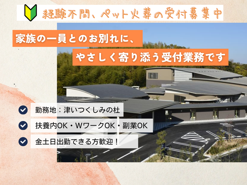 求めている人材 年齢・経験一切不問/フリーター・主婦(夫)歓迎! 【具体的には】 ◎8:15~16:45 12:30~18:30の6時間勤務 ◎金土日祝出勤できる方歓迎 ◎データ入力レベルでパソコン操作が可能な方尚可 ◎受付のみの業務でもOK、火葬作業希望の方もOKです ◎ご遺族の気持ちに寄り添える方 繁忙期に向けて、受付業務をお手伝いしてくださる方を募集しています。 子育てが一段落した方、定年退職後のお仕事を探している方、医療系の学生さん、 ダブルワーク希望の方など、幅広く歓迎いたします。 スタッフが休憩中に「ちょこっと」お手伝いしていただけるだけでも大変助かります。 その場合はお時間内にできる仕事をお願いする予定です。 短時間からの勤務も可能ですので、ライフスタイルに合わせてご相談ください。 長時間勤務可能な方も大歓迎です