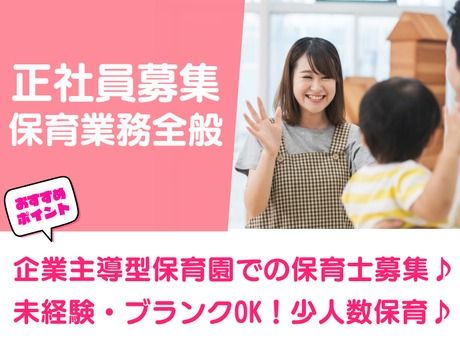 仕事内容 \ここがポイント/ ★正社員で安定した働き方が叶う! ★定員30名の少人数保育でゆったり関われる♪ ★未経験・ブランクOK!丁寧なフォロー体制◎ ★子どもとしっかり向き合える環境♪ ★パート希望の方も相談OK! *・。・。*・。・。*・。・。* <仕事内容> \企業主導型保育園での保育士募集♪/ 定員30名の小さな保育園で、 0~5歳児の保育業務全般をお願いします。 ・保育日誌や連絡帳の記入 ・週案・月案の作成 ・保護者対応 など 子ども一人ひとりとじっくり向き合える 落ち着いた保育ができる環境です◎ 未経験の方やブランクのある方も大歓迎! 先輩スタッフがしっかりサポートしてくれるので、 安心して業務を覚えていけます♪ 「もう一度保育の現場で働きたい」 「子どもとしっかり関われる環境がいい」 そんな方にピッタリの職場です! パート勤務をご希望の方もご相談ください♪ *・。・。*・。・。*・。・。*