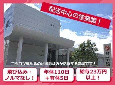 仕事内容 *-ここが強みです!-* ★飛び込み・新規テレアポ・ノルマなし! ★賞与年3回(決算賞与含む)で安定収入! ★転勤なし/ 年休110日でプライベートも確保! ★平均残業時間が月20時間以内!(1日1時間程) ★未経験で営業経験を積みたい人もOK ★稼ぎたい方向けの報奨金制度もあり *-* 【仕事内容】 お客様は、病院、飲食店、スーパーなど担当エリアによって様々です。 お客様のニーズに合わせ、 1万点以上の豊富な商品から 最適な「食」の提案をします。 【具体的な提案例】 《飲食店向け》 料理長・店長の方へ提案を行います。 季節メニュー、コスト削減等の課題に対し、 トレンド食材の提案、新メニュー開発のサポートをさせていただきます。 《スーパーマーケット向け》 店舗の惣菜責任者との情報交換でお困りをヒアリング。当社の小売店担当と連携しながら提案を進めます。 総菜・パンコーナー向けの半加工品など、 人手不足解消や品揃えの拡充に貢献させていただいています。 【1日のスケジュール例】 ▼8:00 出社・朝礼 ▼8:30 配送&営業へ出発! ▼12:00 昼食 ▼13:00 午後の配送&営業。新商品のご案内も! ▼15:30 帰社。事務作業や翌日の準備 ▼17:30 業務が終わり次第、終業。「お疲れ様でした!」 *-* ★【報奨金制度】★ ・ノルマはありませんが、しっかり稼ぎたい人向けの仕組みもあり、実は毎月6割がインセンティブを獲得! ・インセンティブで年間+40万円以上も可能です! ※詳細は面接時にお話いたします! <モデル年収> ・一般社員 年収375万円/(入社2年目) ・主任 年収435万円/(入社6年目、結婚) ・チーフ 年収490万円/(入社8年目、第1子誕生) ・課長 年収580万円/(入社14年目、第2子あり) 【アピールポイント】 *-* 【未経験でも安心】 ★元販売職や元飲食店スタッフの先輩も活躍中! 独り立ちまでの約1~2ヶ月、 商品知識からお客様との話し方まで、 先輩がマンツーマンで丁寧に教えますので、 営業経験がなくても全く問題ありません! 営業職といえば話し上手でないと…と思われるかもしれませんが 当社の営業はまじめにコツコツ進めることが得意な方が活躍する職場です。 注文いただいた商品を正確にお届けすることがお客様の 信頼獲得の第一歩です。実際に営業成績にもつながります。 もちろん間違っても社内で追加配送しながら対応するので 未経験の方も活躍いただける職場です。 【社内研修制度】 ・新入社員研修 ・通信教育講座(JFSAカレッジ) ・OJT研修 ・年次研修 ・あぐら └社内コミュニケーションの一環で行っている集合研修です。社内課題をテーマに全員でディスカッションし働きやすさをみんなで作っています。世代、役職別で行うためとても活発な会になります 社内研修制度もが充実しているので、 未経験でも安心! 通信教育講座は会社負担で受講可能で、 資格取得支援も行なっています! *-* 《将来のキャリアパス》 ・ 社歴・年齢に関係なく、頑張りは正当評価! ・ 目標達成率に応じたインセンティブ制度あり! ・若手のうちから昇給、昇進のチャンス! やる気次第で誰でもチャレンジできる環境です! 《数字で見る南給》 ★男女比 :男性70%、女性30% ★平均年齢:39.5歳 ★平均勤続年数:8.7年 ★平均有給取得日数:10日 ★新卒/中途比率:新卒15%、中途85%