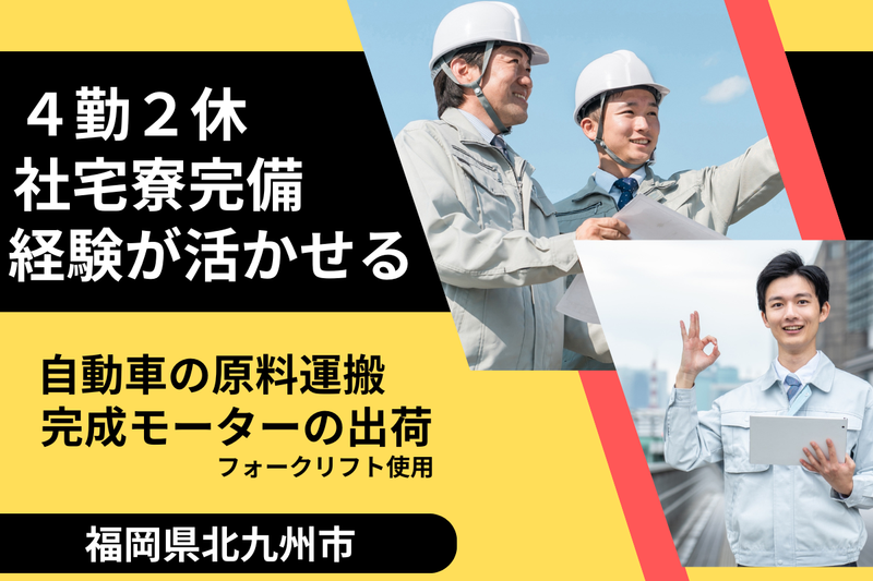 仕事内容 《 ここがポイント! 》 ●フォークor玉掛けorクレーン有資格採用 ●月収28万円以上の高収入可! ●生活家電付き1R寮あり! ●日払いOK!24時間365日対応 北九州市の 自動車用モーターコア製造会社で 倉庫内軽作業をお任せします。 - 自動車用モーターコアの 製造に関わる原料や製品の 運搬・出荷作業をお任せします。 ▼具体的には… ① モーターコア原料(ロール状鋼板)の運搬 └クレーン・フォークリフトを使用します ② 完成したモーターコアの出荷準備・積込み ③ 作業工程で発生する鉄くずの回収・運搬 入社後は教育研修あり。 配属先の特徴や業務の流れ、 コツやポイントなどを 丁寧にレクチャーします! - 《 仕事のポイント 》 コツコツ、黙々と進める軽作業。 フォーク、玉掛け、クレーン いずれかの資格があれば、 学歴や経験は一切不問です。 また、エヌエス・テックの社員が ほぼ毎日就業先へ訪問しているので、 仕事や人間関係の悩みを気軽に相談OK! 派遣先との間に立ち、 問題解決をサポートします。 責任を一人で抱え込まなくてOKです。 - 《 スタッフの特徴 》 20代・30代・40代の世代の 男性スタッフが活躍しています! 家具家電付きの1R寮があり、 カバン一つで就業可能。 地元や近くで働き続けたい方も 普段と違う場所で働きたい方も どちらの方も歓迎しています。 ▼そのほか… 当社はフルタイムで 長く働ける環境を用意しています。 もし工場が縮小した際も次の職場を案内し、 収入UPや日勤希望などの異動もサポート! 正社員登用の道もあり、 合わなければ異動も可能です。 安定して長期就業できますよ。