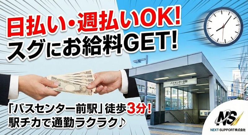 仕事内容 / たった1枚の簡単なマニュアル通り にやれば大丈夫。 \ 具体的には… ◆サービスの最初のご案内 ◆新商品・キャンペーンの最初のご案内 シフトも超自由 「今週はテスト期間だから週0日」 「来週は旅行資金のために週5日」 そんなワガママシフトも大歓迎! 週払いOKなので、急な出費にも即対応できます。 バスセンター前駅徒歩1分なので、 学校帰りやサークル前のスキマ時間に最適です。