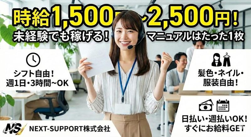 職場環境 様々な商材を取り扱っているため、 あなたにぴったりなお仕事が見つかりますよ☆ マニュアル1枚で完結する簡単なお仕事! その後は社員さんにお任せ! 綺麗なネイル、派手な髪色、髭がどんなに 伸びていても大丈夫です◎ 週1~5日勤務なのでWワークの方も安心♪ 喫煙所:喫煙所あり(屋外) 喫煙スペース完備しております♪