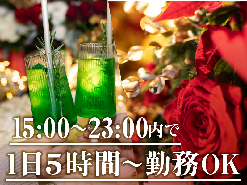 休日休暇 《シフトによる》 「講義が終わってからお小遣い稼ぎ」 「本業との掛け持ちで週3日」 「土日祝メインで週5日勤務」 「週4日で趣味と両立」 「1日5時間で無理なく勤務」 …など、シフト自由! プライベートとの両立も しやすい環境ですよ♪ ================== 《1日の流れの例》 ▼15~20時勤務の場合 【15:00~17:00】 出勤してお花のメンテナンスや開店準備 【17:00~20:00】 開店!お客様のご案内や接客 ▼18~23時勤務の場合 【18:00~22:00】 お客様のご案内や接客、カクテル作り 【22:00~23:00】 接客、締め作業に向けたお手伝い