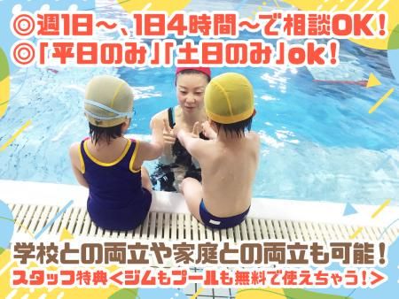 仕事内容 水泳コーチのアシスタント業務をお願いします。 具体的には… 水泳のバタ足やクロールの補助を行ったり メインコーチのアシスタント業務、 プール内での監視業務などをお任せ! 生徒さんは[幼児~小学生]クラスになります。 スキルや経験、希望に合わせて 技術指導の少ないクラスをお任せしたり あなたの働きやすい環境作りを心がけています! ー <メリットいっぱい!> ✅ジムとプールが無料で使い放題◎ ✅未経験OK!アシスタント業務から◎(未経験者多数在籍) ✅泳げなくてもOK! ✅子ども好きな方!将来、保育士や教育系の道に進みたい方! ✅「昔スイミングスクールに通っていたので」という理由で入ってきてくれた方もいます♪ ✅平日のみok!シフト柔軟! \電話応募や問い合わせ受付中!/ 電話応募お気軽にお待ちしてます! TEL 06-6352-8816 採用担当までご連絡ください! 「求人を見て応募しました」とお伝えいただければスムーズです! ―――――――――――――・・・* 《職場の雰囲気》 バイト同士の仲が良く、シフトの相談や仕事の相談しやすい環境です! そのため、従業員は入ったら長く続けている人が多いです♪ ―――――――――――――・・・* ■未経験でも大丈夫…? もちろん大歓迎です♪ 基本はアシスタント業務なので、 『いきなり指導しないといけない!』 という不安は一切ありません! ■シフト柔軟で働きやすさ抜群! 「平日のみ」ok! 学校との両立や家庭との両立も◎ 働きやすいから続けやすい♪ ■嬉しい特典♪ジム無料! ジムは無料で使えちゃう♪ 無料でプールも泳げます。 軽く体を動かしたい!健康維持の為に! そんな想いもお得に叶います! ―――――――――――――・・・* <スタッフさんにインタビュー> 【Q.応募したきっかけは?】 子どもが好きという理由で応募しました。 私は将来学校の先生を目指しています。 将来の経験のために、 “子どもに触れ合う場”や “子どもに何かを教える場”を 探していました。 そんな時にここの求人を 見つけたのがきっかけでした! 【Q.職場の雰囲気はどうですか?】 本当に仲の良い職場ですね。笑 基本は学生が多いのですが、 年の離れた社員さんも いつも気にかけてくれる環境で、 ノビノビさせてもらってます!笑 -【スタッフ構成】- ◇スイミング ┗スイミングとジムのコーチ合わせて30名程! スイミングは 7割が学生さんで3割がダブルワーカーさんです! 学生さんと主婦(夫)さんの割合も 半々なので、幅広い年代の方が活躍中です☆ -