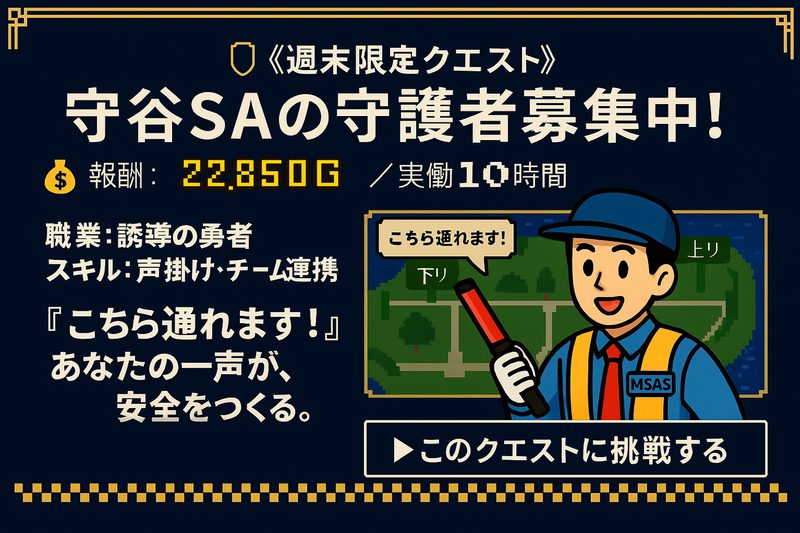 仕事内容 ━━━━\\レア案件×高収入//━━━━ \守谷SA 駐車場 誘導スタッフ募集/ ―――――――――――――――――― ★土日祝・大型連休だけの勤務OK★ 午前+午後の“2現場セット勤務”で日給2.2万円超! 「学業や本業がない日に集中して稼ぎたい」 そんな働き方にぴったりです◎ ━━━━━━━━━━━━━━━━━━━ 【仕事内容】 守谷サービスエリアの駐車場にて、来場者の安全な通行をサポートしていただきます。 「こちら通れます」「お気をつけてお進みください」などの声かけとともに、車両や歩行者の流れを安全に保つ業務です。 ▶ 午前(下り)・午後(上り)の2現場連勤で1日しっかり勤務。 →「体を動かすのが好き」「集中して働きたい」という方にぴったり! 混雑時もチームで声を掛け合いながら対応するため、未経験の方も安心してスタートできます。 【スタッフの声】 ▶ 「1日10時間って大変かな…と思ってたけど」 → 午前と午後でメリハリがあるので、思っていたより早く感じます! (30代/フリーター) ▶ 「警備ってちょっと堅いイメージがあったけど…」 → 実際は声かけや誘導など“人と関わる”あたたかい仕事でした。 (20代/学生) ▶ 「副業で探してたけど、土日だけでこれだけ稼げるのはレアでした」 → 週1〜2日でも、1回で2万円以上はありがたいです! (30代/会社員) ▶ 「混雑したときどうなるんだろうって心配だったけど」 → チームで分担して動けるので、自分1人で抱えることはありません◎ (40代/主婦) 週末や連休だけの“集中シフト”で、しっかり稼ぎながら人の役に立つ仕事。 あなたも、守谷SAを一緒に支える仲間になりませんか?