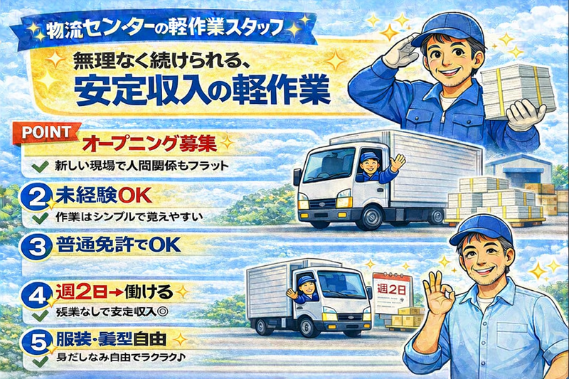 求めている人材 ⭐中高年活躍中⭐ 【必須】 ◆普通免許をお持ちの方 ◆PCで簡単な入力ができる方 【歓迎】 ◆フォークリフト免許をお持ちの方 ⇒必須ではありません!! ⇒資格取得支援制度あり◎ (取得費用は会社全額負担) \こんな方にピッタリ!/ *コツコツ作業・仕分け作業が好きな方 *適度に体を動かしながら働きたい方 *長期で安定して働きたい方 *モクモク作業とチーム作業の両方が好きな方 \こんな経験がある方歓迎!/ *倉庫作業・軽作業の経験がある方 *配送ドライバーの経験がある方 (2tトラックなど) *PCで簡単な入力をしたことがある方 初めての倉庫・物流業務でも大歓迎です◎ ༶ ༶ ༶ ༶ ༶ ༶ ༶ ༶ ༶ ༶ ༶ ༶ ༶ ༶ ༶ ༶ ༶ ༶༶ ༶ ༶ Q:実際に働いてみてどうですか? A:荷受けや仕分け、配送作業が中心で、 難しい作業はありません。 作業の流れが決まっているので、 モクモク集中して取り組めます。 配送業務もあるので、 少し体を動かす仕事がしたい方にも ぴったりだと思います! Q:この仕事のやりがいは何ですか? A:仕分けや納品をきちんと行うことで、 各営業所のスタッフがスムーズに 仕事を進められる点にやりがいを感じます。 資格(フォークリフト免許など) を活かせる場面もあり、 自分のスキルが役立つのが嬉しいです♪